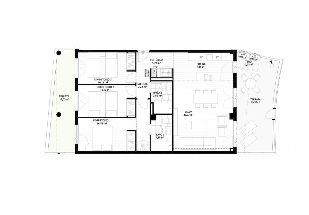 Appartement d'angle de 3 chambres avec 2 terrasses (avant et arrière).