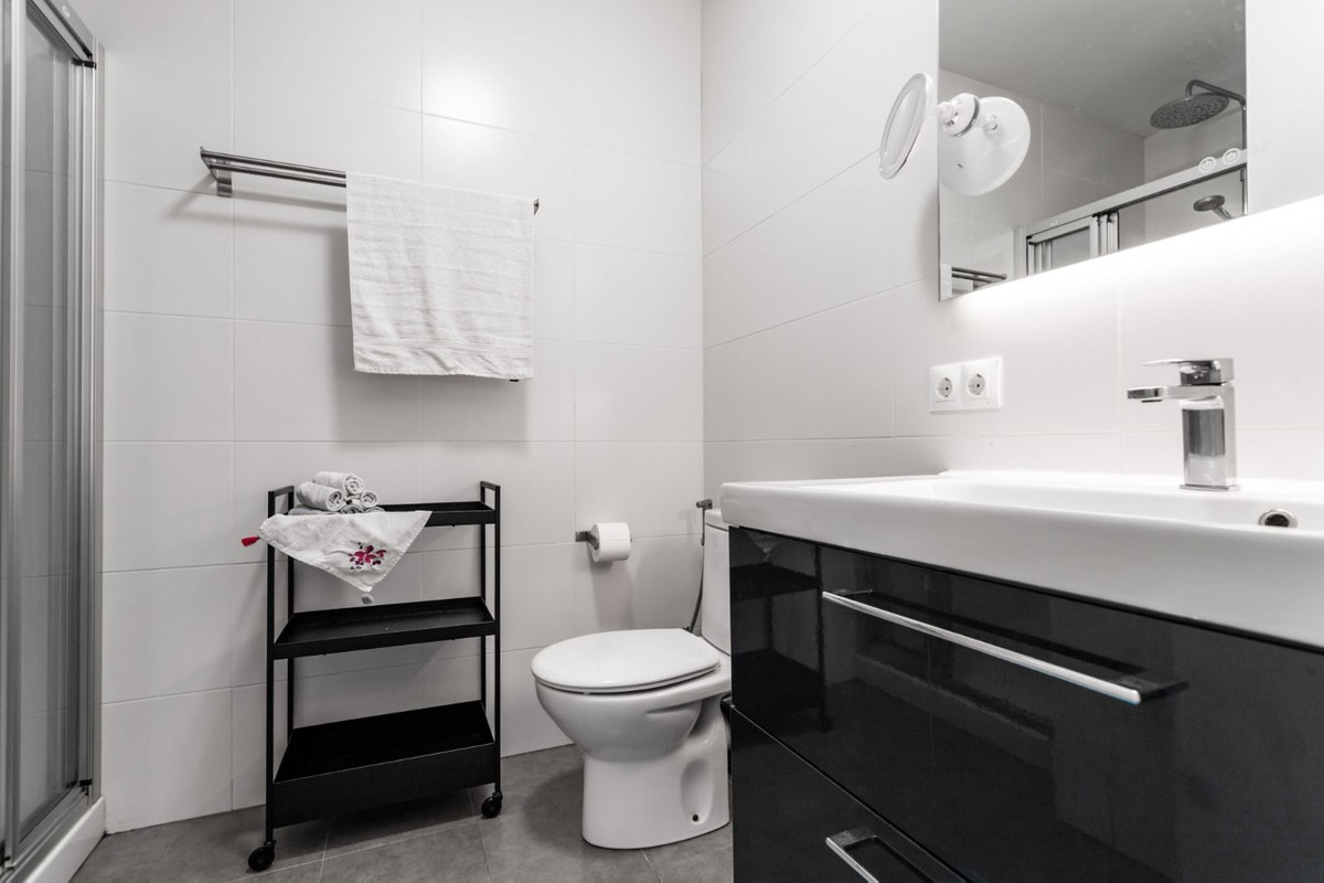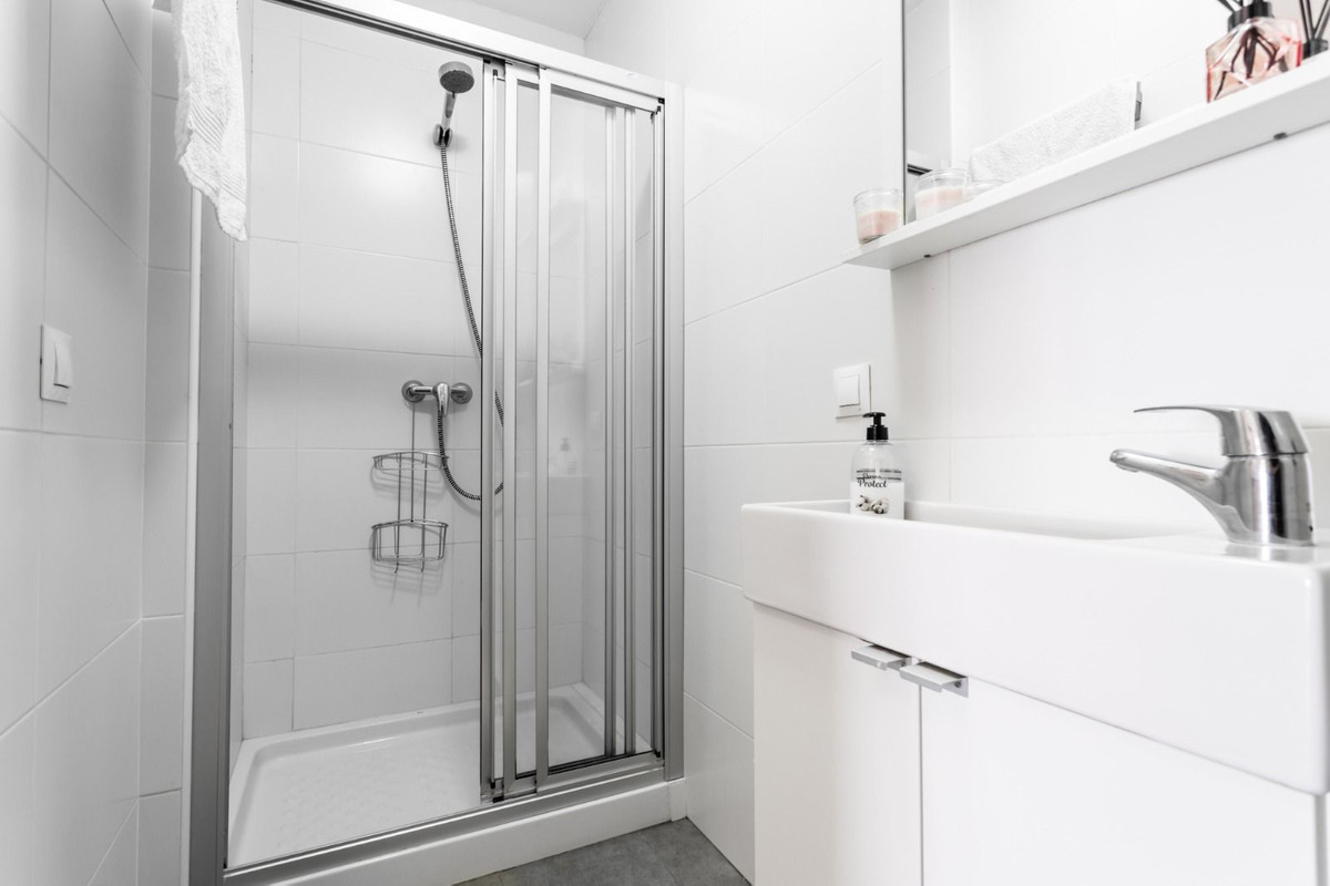 L'appartement se compose d'un hall d'entrée, d'un salon lumineux avec cuisine ouverte et accès à la terrasse, d'une chambre avec salle de bains attenante et placards intégrés, d'une autre chambre avec placards et d'une deuxième salle de bains.