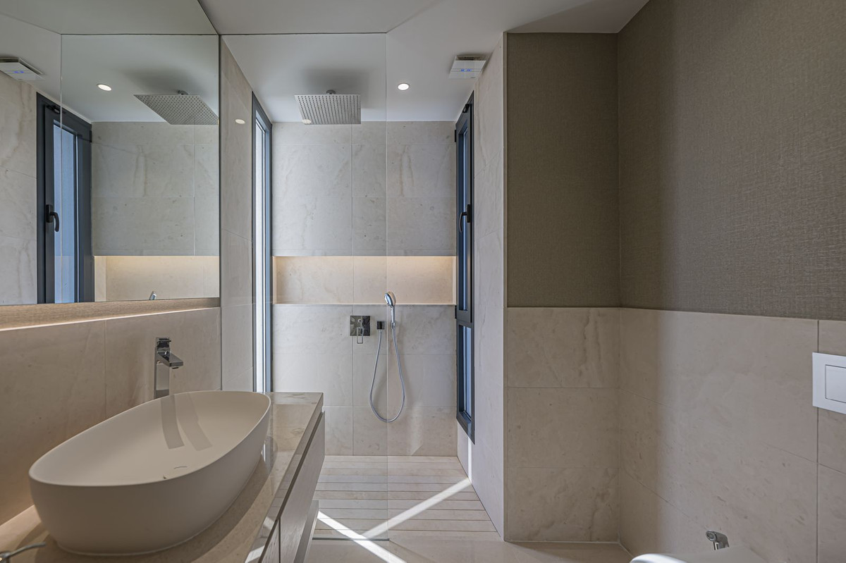 Elegant contemporary-style villa spread over three and four floors with a total of five bedrooms, five bathrooms, a large living room with an open-plan kitchen and dining area, a spectacular basement with a home theater, bar, billiards table, and a large solarium with beautiful sea and mountain views.