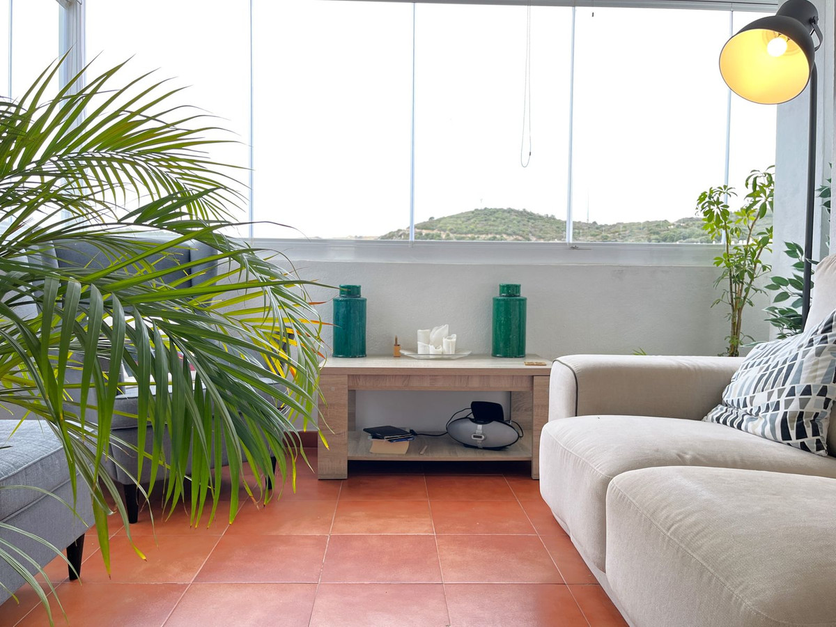 La propriété se distingue par sa grande terrasse panoramique offrant une vue imprenable sur le golf et les montagnes, l'endroit idéal pour profiter du soleil et de la tranquillité. Dès l'entrée, vous découvrirez un salon-salle à manger lumineux et spacieux donnant sur une terrasse vitrée avec rideaux coulissants, idéale comme espace de vie supplémentaire. La cuisine entièrement rénovée et équipée offre des finitions haut de gamme.