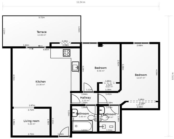 2 Chambres, 2 Salles de bains, Surface construite 90 m², Terrasse 16 m².