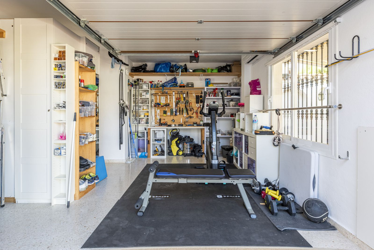 Vous trouverez également un sauna avec système audio intégré et une vue sur le jardin pour les journées plus fraîches d'hiver. Le garage, équipé d'une porte électrique et de la climatisation, sert actuellement de salle de sport et de rangement pratique. Un parking supplémentaire est disponible dans l'allée, sous un auvent pratique.