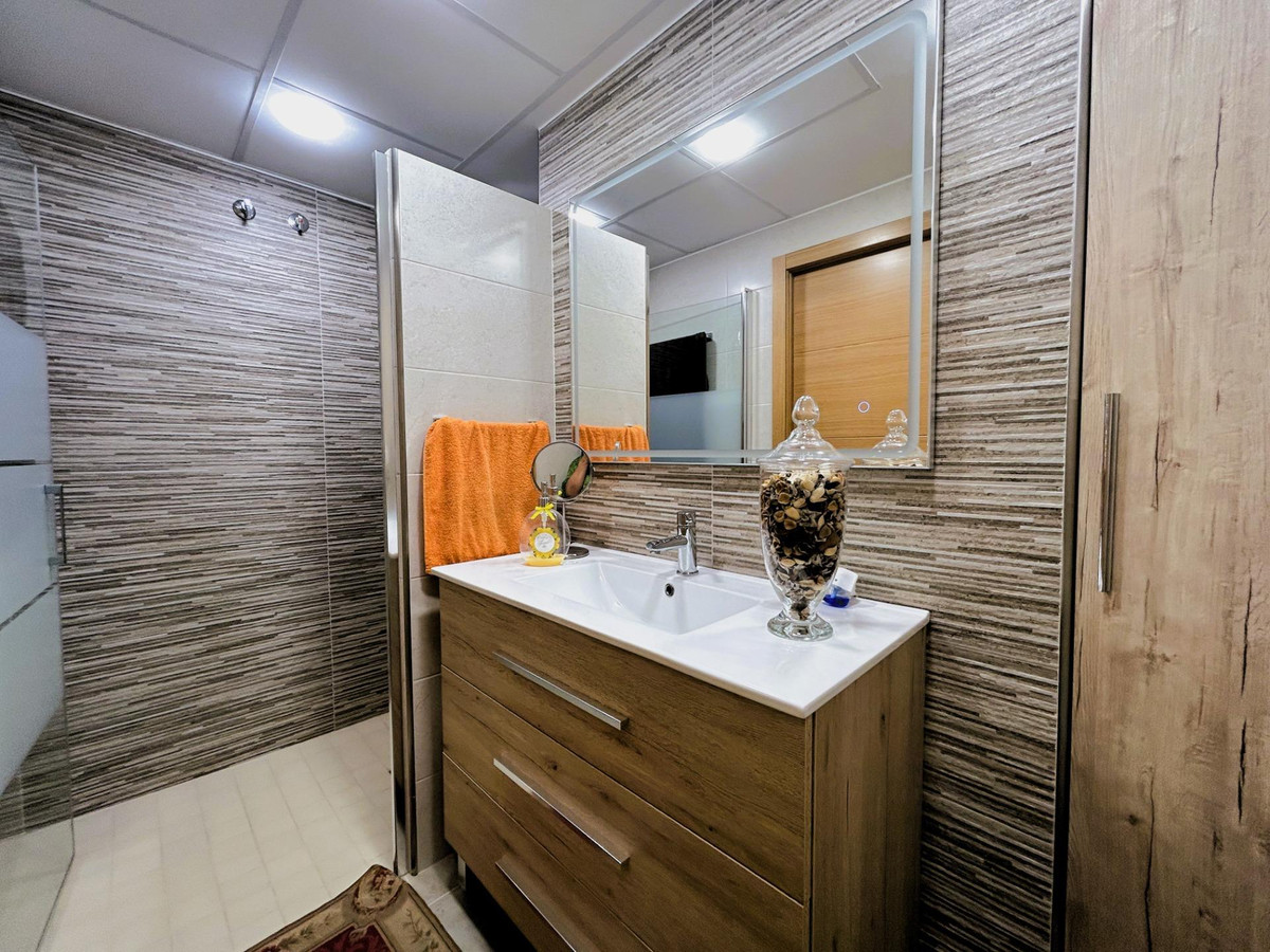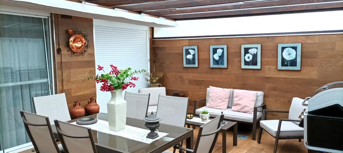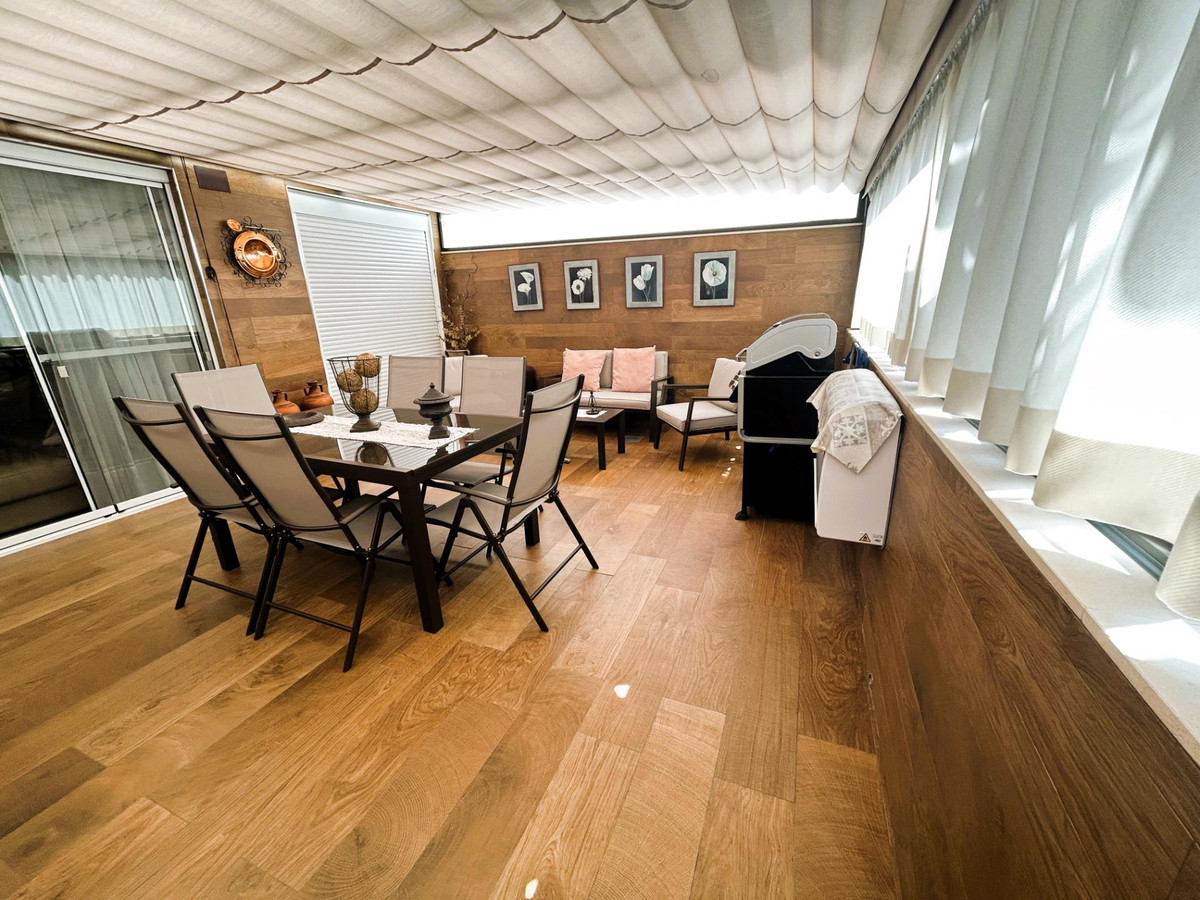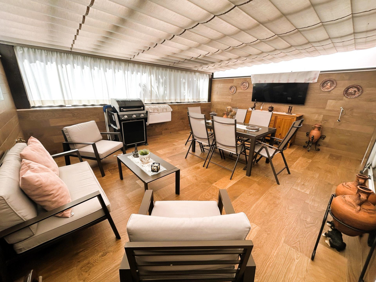 The master bedroom has access to the terrace, the bathroom is renovated, and there is another bedroom with a comfortable dressing room. The living room connects to a glazed terrace, perfect for year-round use; it even has air conditioning! And it comes with a garage and storage room included in the price.