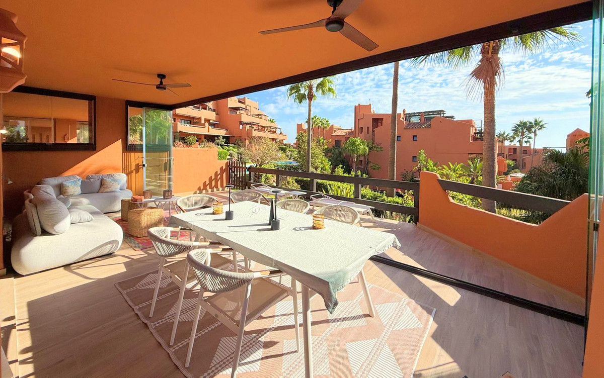 GROUND-FLOOR APARTMENT WITH LARGE TERRACE AND TOURIST LICENSE NEAR THE SEA. Privileged location in a charming Mediterranean-style complex, just 200 m from the beach and only a 5-minute drive from Estepona and the vibrant Duquesa Marina, where you’ll find all kinds of services, restaurants, and leisure options. This beautiful ground-floor apartment stands out for its brightness, thanks to its southeast orientation, and for its magnificent newly renovated terrace, featuring glass curtains, an outdoor kitchen area, and elegant parquet flooring that adds warmth and style.