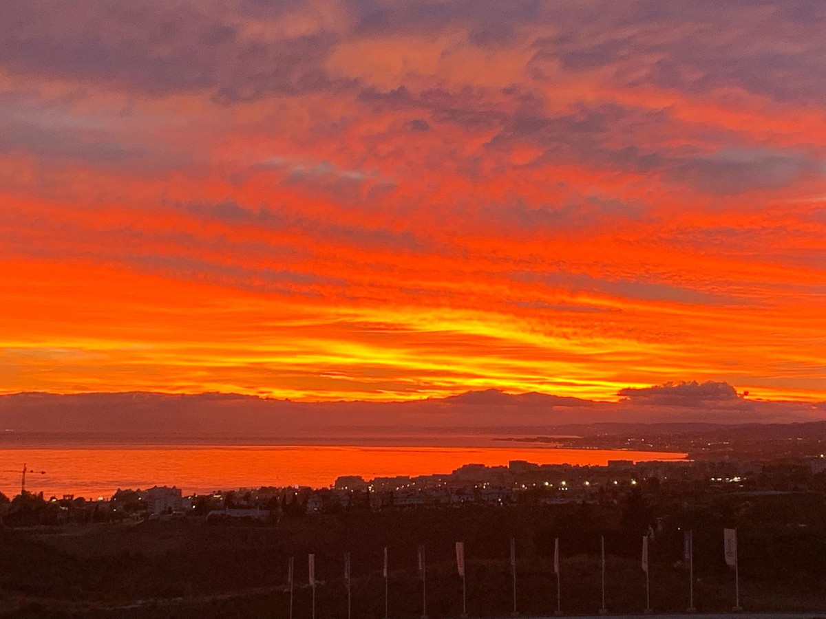 A sophisticated modern stairway with a large window (offering sea views) leads us upstairs to the master bedroom, a luxe and inviting space where one can enjoy spectacular views of the sea and coastline while lounging in bed. On a clear day, the outline of the African mountain range can be seen, along with Gibraltar and the nearby Sierra Blanca mountain range. The room comes with ample built-in closets. The ensuite bathroom is done in black slabs with white veining, which, juxtaposed with the white sink and cabinetry, makes it simply stunning!! On that same level, we find a large second terrace, ideal for sunbathing, as it is entirely private, where one can enjoy a snack at the high table and, undoubtedly, the incredible 360º views. It comes equipped with an outdoor shower, a nice addition for a quick refresh while enjoying the summer sun.