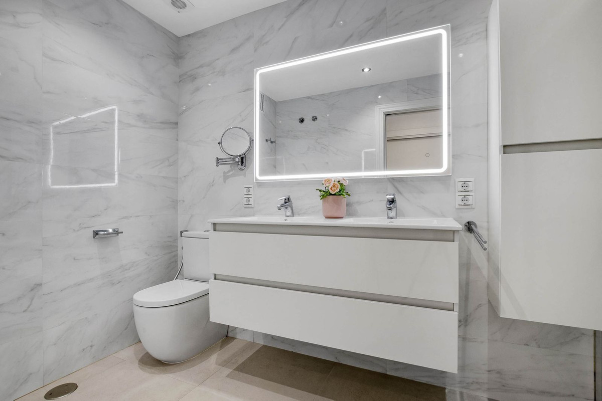 La chambre principale, spacieuse, dispose d'une salle de bains attenante avec double vasque et douche à l'italienne, ainsi que de trois placards intégrés et d'un accès à la terrasse principale. La deuxième chambre, dotée de placards intégrés laqués blancs et d'un balcon privé, jouxte une salle de bains moderne et rénovée avec douche.