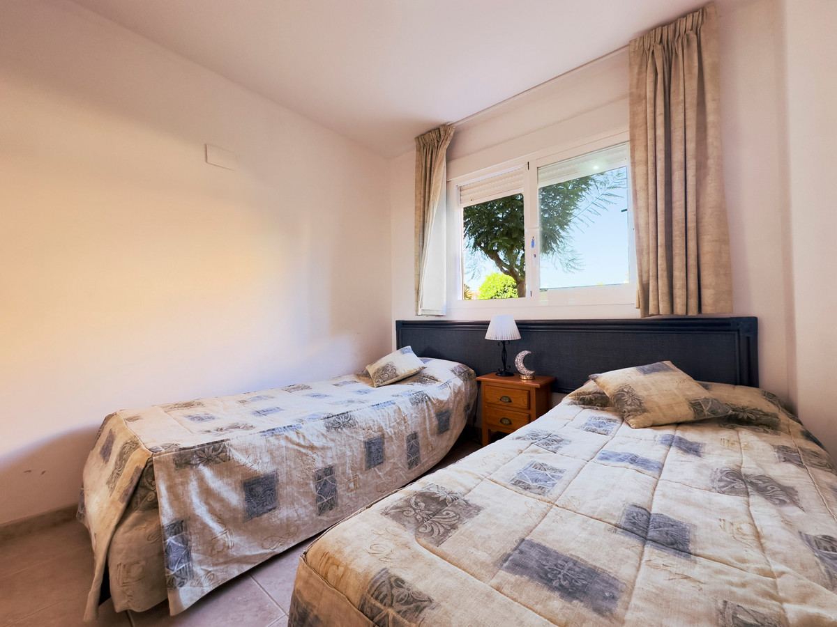 Ce logement de 80 m² habitables (70 m² de surface construite) offre un agencement fonctionnel et lumineux, avec deux chambres et deux salles de bains, dont une attenante. Le séjour principal s'ouvre sur une terrasse couverte privative de 15 m², idéale pour profiter du climat méditerranéen et d'une agréable vue sur le jardin commun. La cuisine entièrement équipée comprend une buanderie séparée et des placards intégrés pratiques. Parmi ses atouts, on compte un sol en marbre, la climatisation, un accès pour les personnes à mobilité réduite et une connexion internet fibre optique. Le logement est en parfait état et peut être livré meublé.