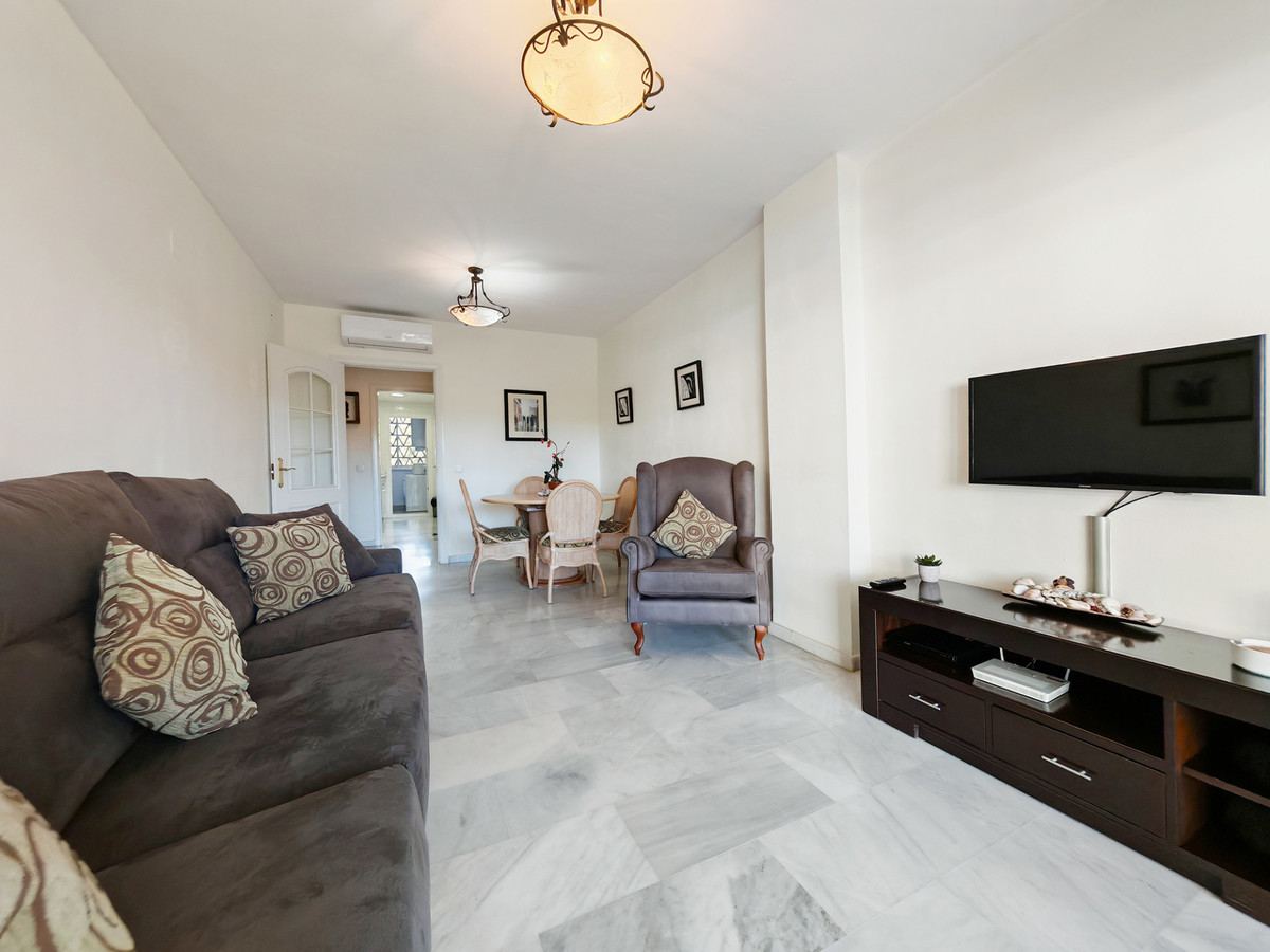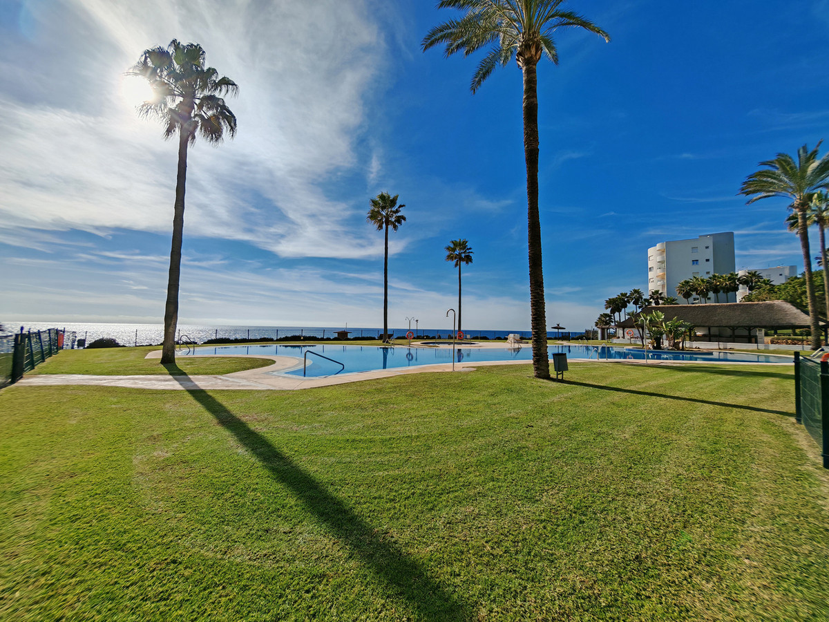 Appartement à vendre à Mijas Costa, avec 2 chambres, 2 salles de bains (dont une attenante), exposé ouest, donnant sur une piscine commune, un garage privé (1 place de parking) et un jardin commun. D'une superficie de 80 m² habitables et 20 m² de terrasse, il bénéficie des prestations suivantes : accès direct à la plage, proximité des commerces et des transports, climatisation, entièrement meublé, cuisine équipée, buanderie, sols en marbre, entrée sécurisée, double vitrage, interphone vidéo, sécurité 24h/24, terrasse privative, cuisine équipée, séjour, vue mer, volets roulants de sécurité, accès internet Wi-Fi, terrasse couverte, service 24h/24, placards intégrés, résidence sécurisée avec ascenseur, vue jardin, vue piscine, accès direct à la plage, portier, proximité de la mer/plage et du golf, portes vitrées, balcon, excellent état, proximité des commerces, du centre-ville et des écoles, caméras de surveillance et animaux domestiques acceptés.