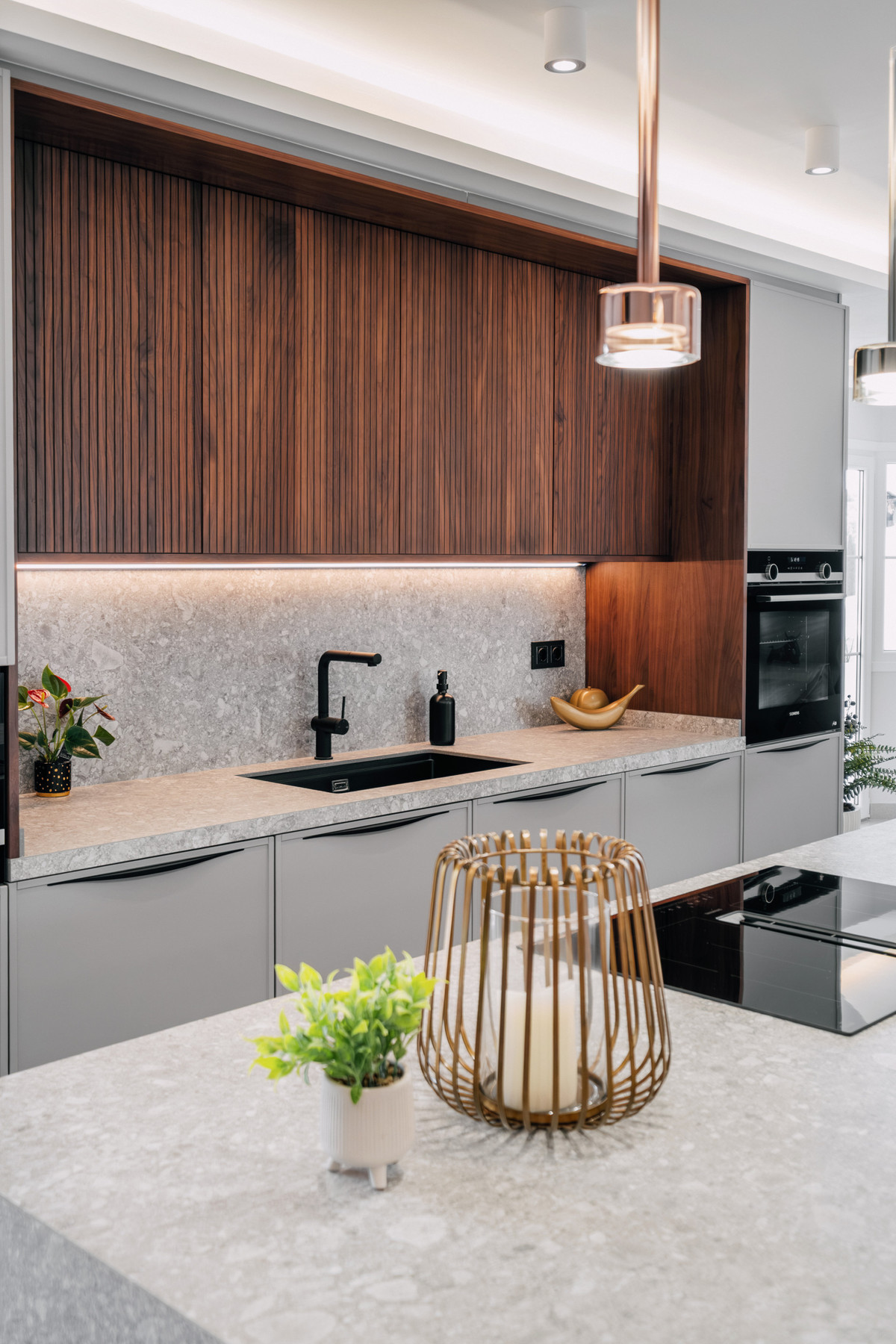 La rénovation, achevée en 2025, allie matériaux naturels, détails en noyer et éclairage chaleureux pour créer un intérieur moderne et apaisant. Le rez-de-chaussée comprend un espace de vie ouvert avec salle à manger et cuisine entièrement équipée, incluant des appareils Siemens, un îlot central en pierre, un réfrigérateur double, une cave à vin intégrée et un office séparé.
