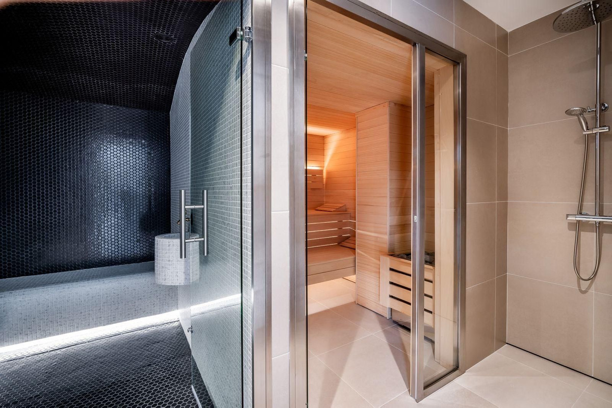 The lower level offers versatile and comfortable spaces, including a self-contained guest apartment with direct access to the garden and pool, an additional bedroom with bathroom, a staff apartment, and a wellness area equipped with a spa, hammam, sauna, and relaxation room.