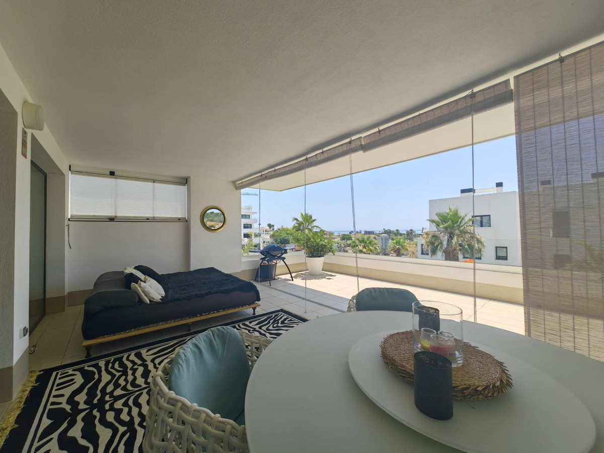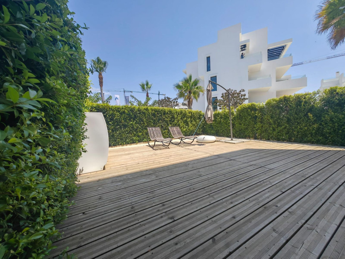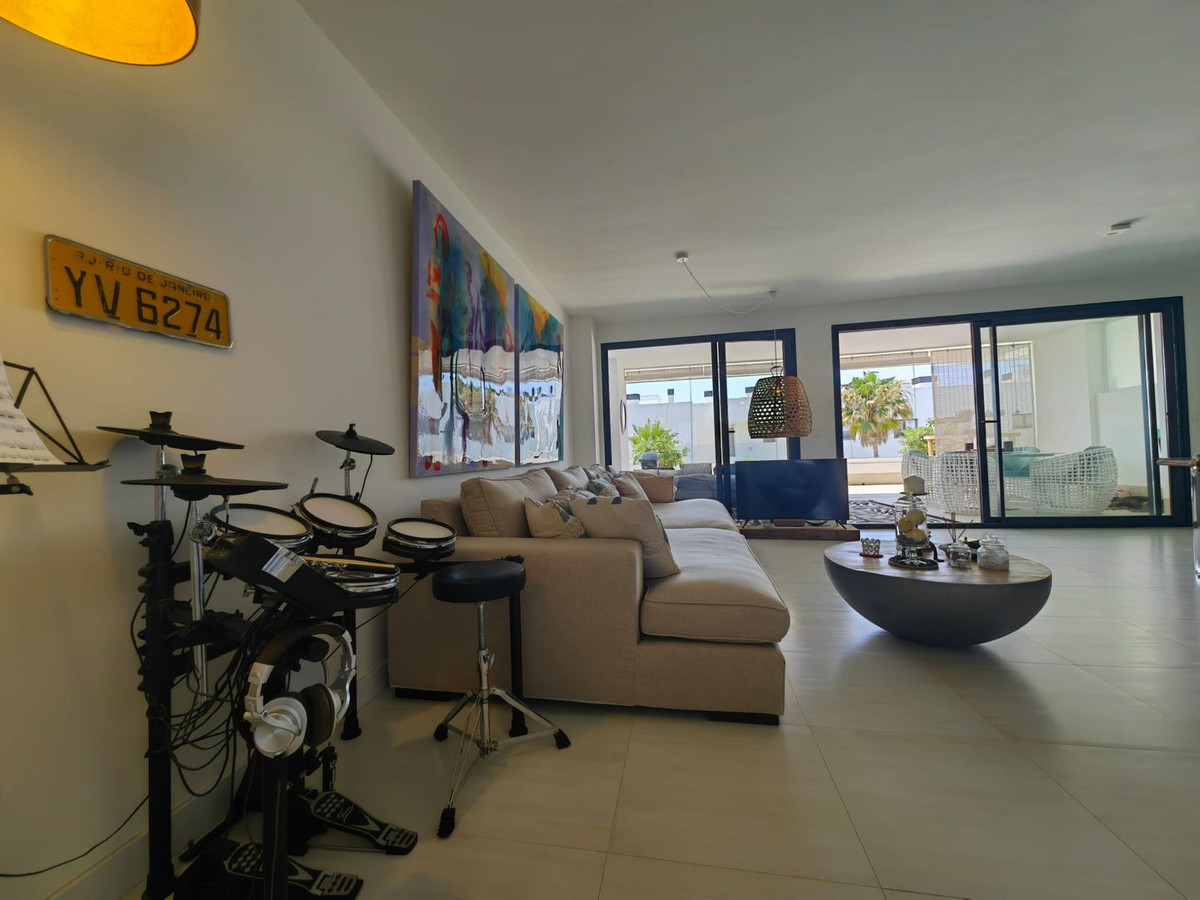 Le séjour lumineux et ouvert s'ouvre sur une grande terrasse semi-couverte exposée plein sud avec vue partielle sur la mer, créant ainsi un cadre idéal pour profiter du soleil de la Costa del Sol tout au long de la journée. À l'arrière, un jardin privé avec terrasse en bois offre un havre de paix, idéal pour les repas en plein air, les barbecues ou tout simplement pour se détendre.