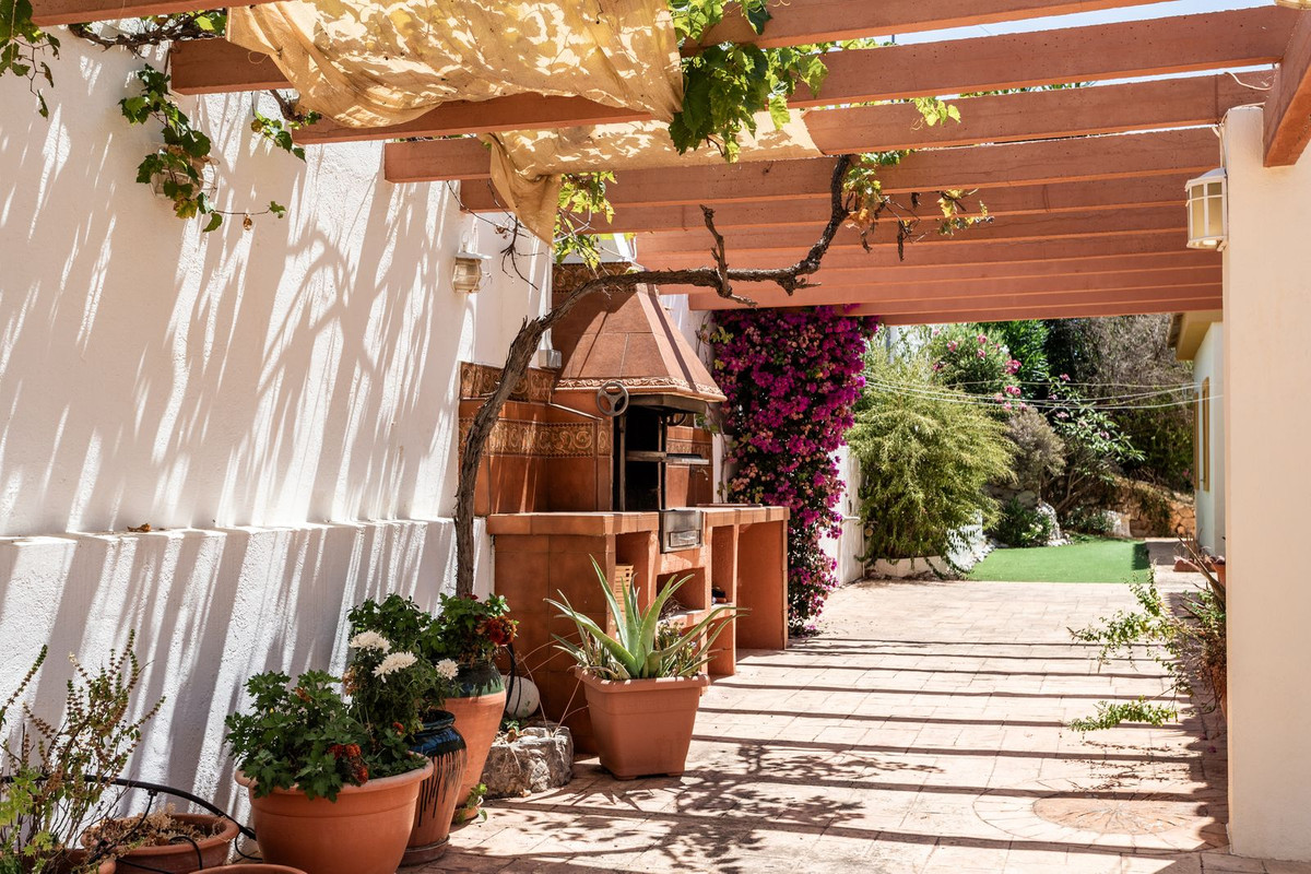 À l'extérieur, vous trouverez une piscine privée, un magnifique jardin arboré d'arbres fruitiers et un espace barbecue convivial ombragé par une pergola – idéal pour des moments de détente entre amis ou en famille, quelle que soit la saison. La villa comprend également un garage et de nombreux rangements.