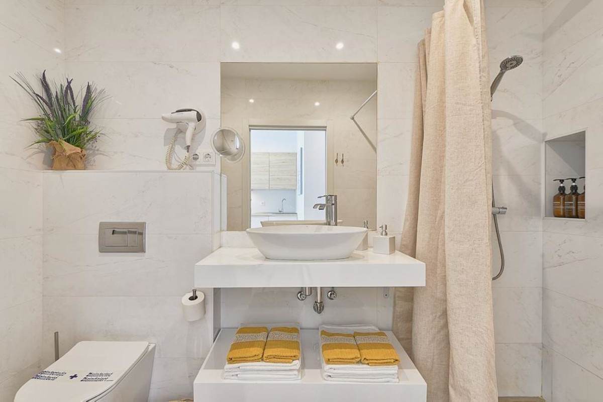 Cet élégant immeuble abrite trois appartements touristiques haut de gamme, équipés d'un ascenseur, ainsi qu'un bar sophistiqué sur le toit offrant une vue sur la mer.