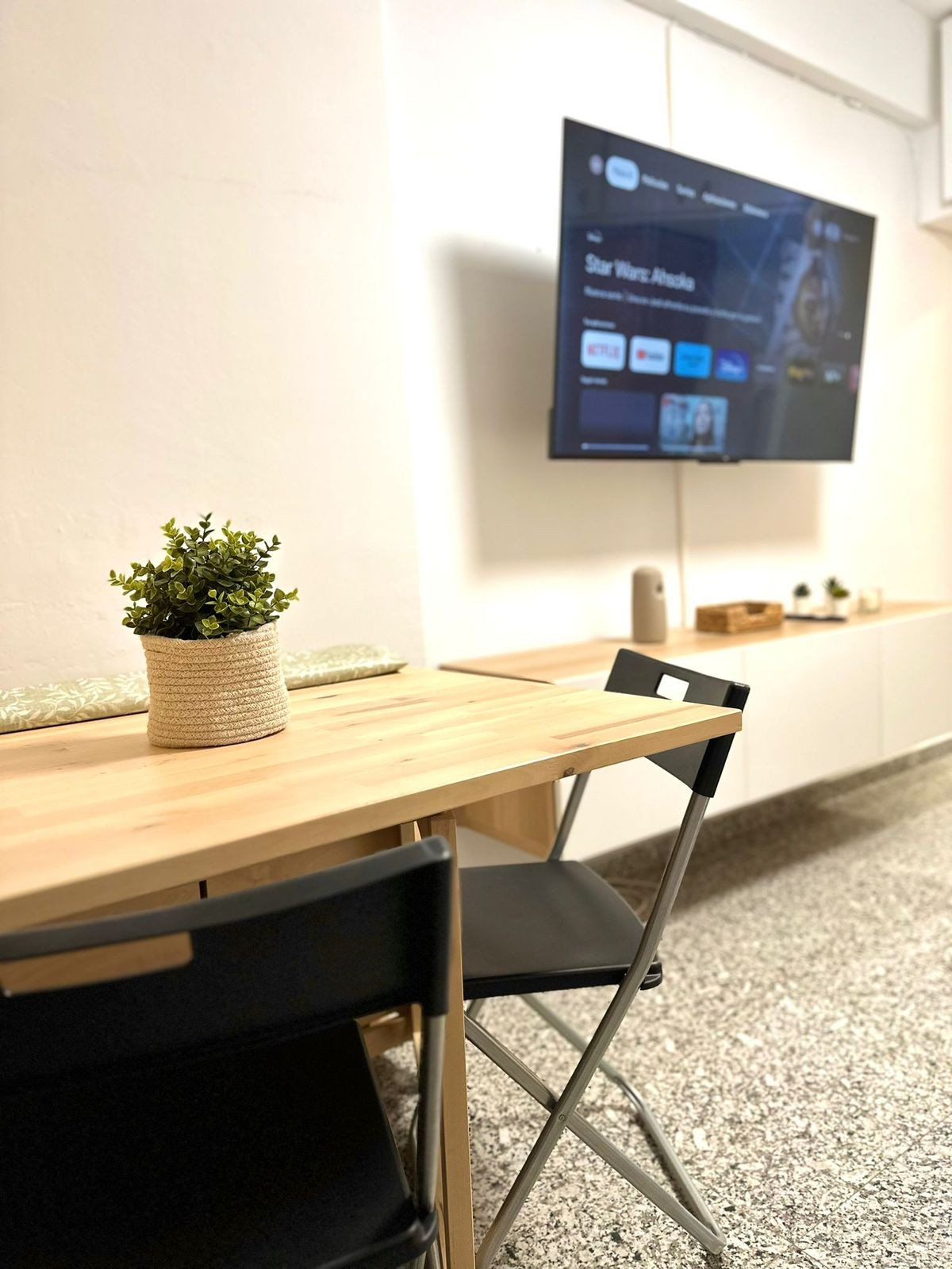 L'intérieur comprend un espace de vie/chambre lumineux s'ouvrant directement sur la terrasse, ainsi qu'une cuisine entièrement équipée et une salle de bains rénovée alliant fonctionnalité et esthétique contemporaine.