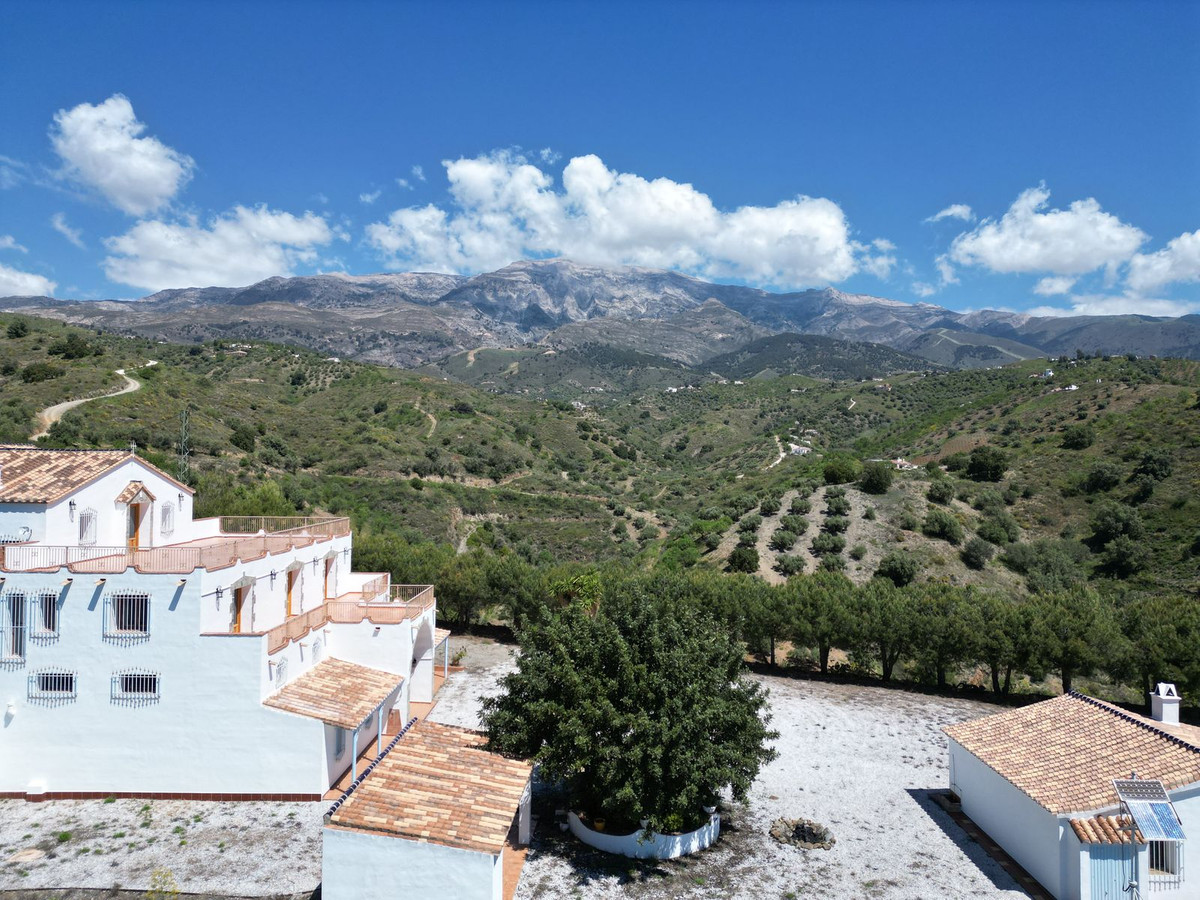 Sous la villa principale, un garage spacieux doté d'impressionnantes portes en bois réalisées sur mesure offre un vaste espace pour plusieurs véhicules ou peut facilement être transformé en atelier, salle de sport, studio d'artiste, voire en quatre chambres supplémentaires. Autour de la villa, près de 100 m² de terrasses et de solariums baignés de soleil offrent des vues panoramiques spectaculaires sur la Sierra de Almijara.