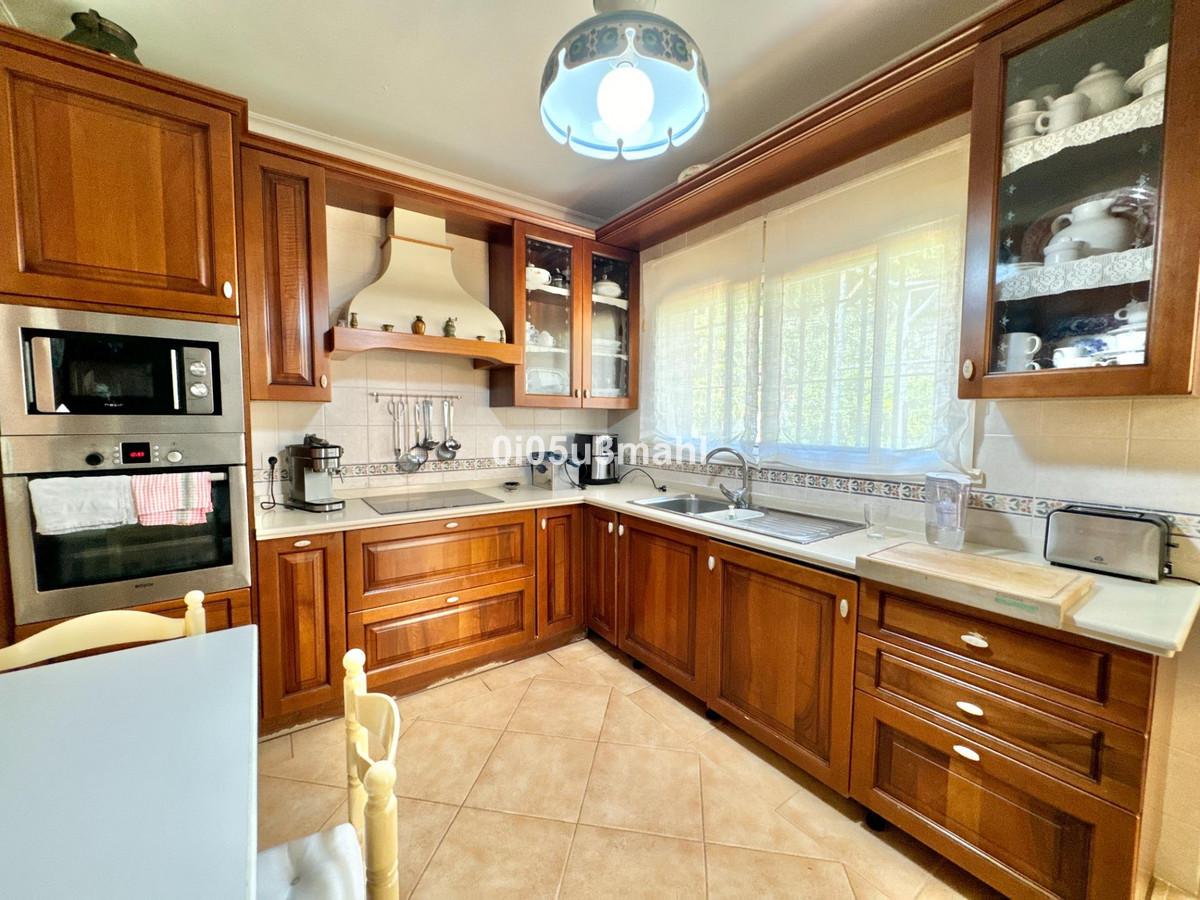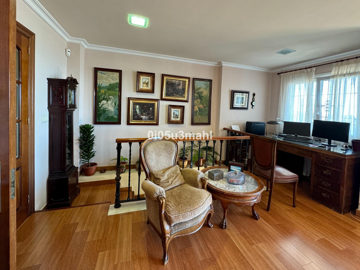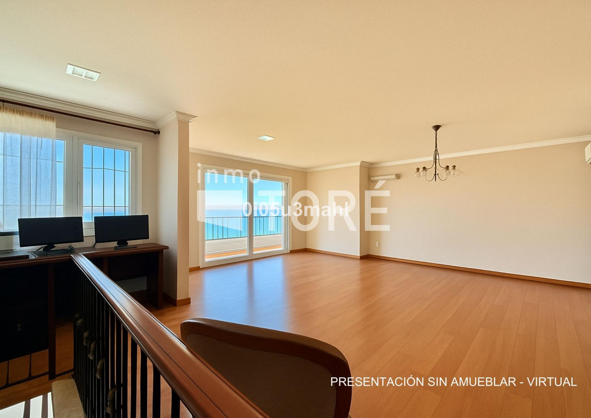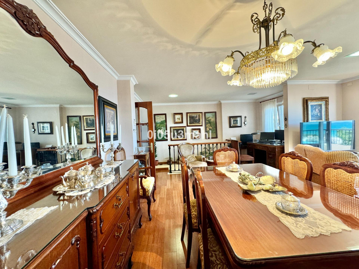La maison, rénovée en 2006, se déploie sur deux niveaux. Au rez-de-chaussée, on trouve un salon avec cheminée, une grande chambre et une salle de bains. Un escalier confortable mène au premier étage où se situe un vaste et lumineux séjour indépendant donnant accès à une grande terrasse offrant une vue imprenable sur la baie de Malaga. La cuisine indépendante, équipée d'appareils électroménagers et agencée avec soin, se distingue par sa fonctionnalité et son espace. Elle offre un environnement polyvalent et bien organisé, avec un accès aisé aux espaces extérieurs pour profiter de repas en plein air. L'étage comprend également quatre chambres spacieuses, dont trois avec vue sur mer, et deux salles de bains, dont une privative.