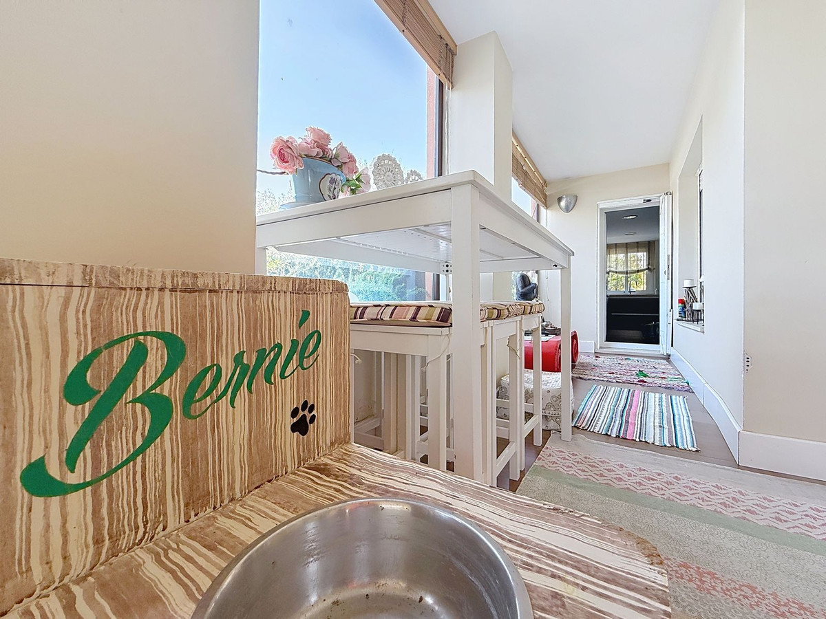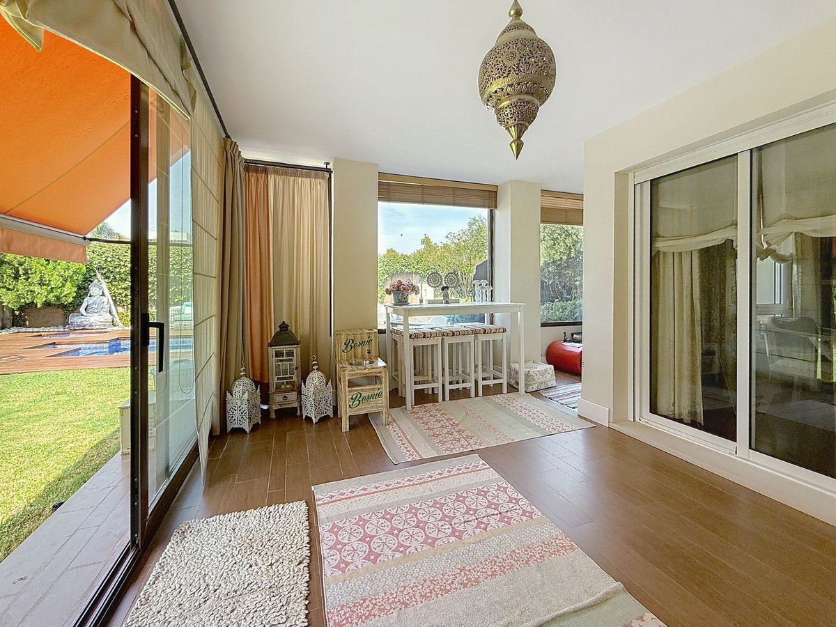 La villa vous accueille avec un hall d'entrée lumineux et des toilettes séparées, avant de dévoiler d'élégants espaces de vie baignés de lumière naturelle. Le salon et la salle à manger, avec leur cheminée chaleureuse et leurs gracieuses fenêtres cintrées, offrent une vue imprenable sur les magnifiques jardins. La cuisine moderne, dotée d'un sol en céramique imitation bois, allie style contemporain et grande facilité d'entretien.