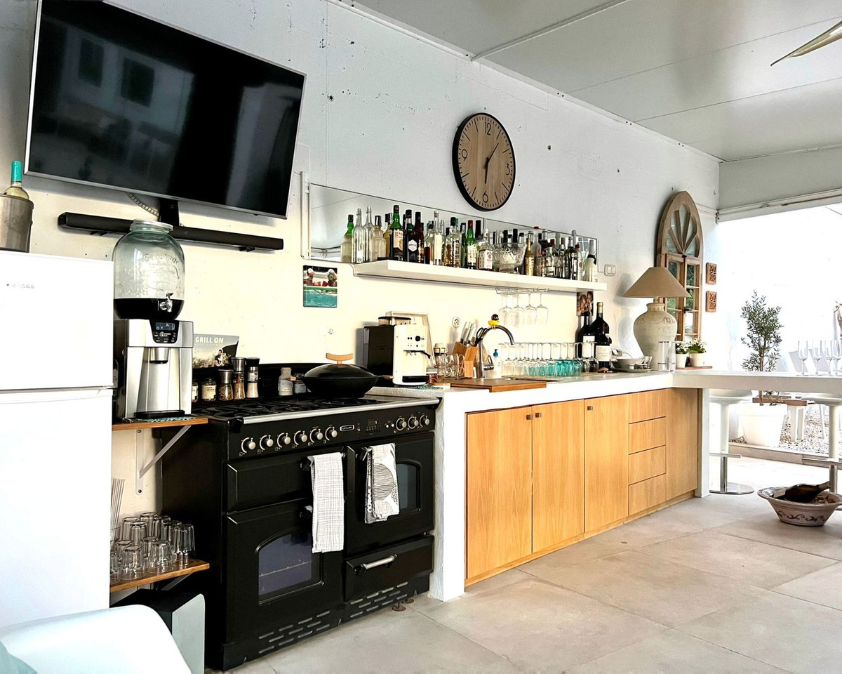 Immense pergola couverte avec cuisine extérieure entièrement équipée et rideaux de verre, créant une terrasse de divertissement magique utilisable toute l'année, protégée du vent et des soirées plus fraîches.