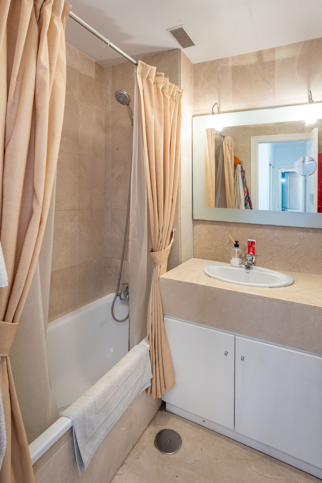 La propriété est en bon état, avec 3 chambres, 3 salles de bains, 3 terrasses ouvertes, une cuisine entièrement équipée et meublée, et la climatisation dans toutes les pièces.