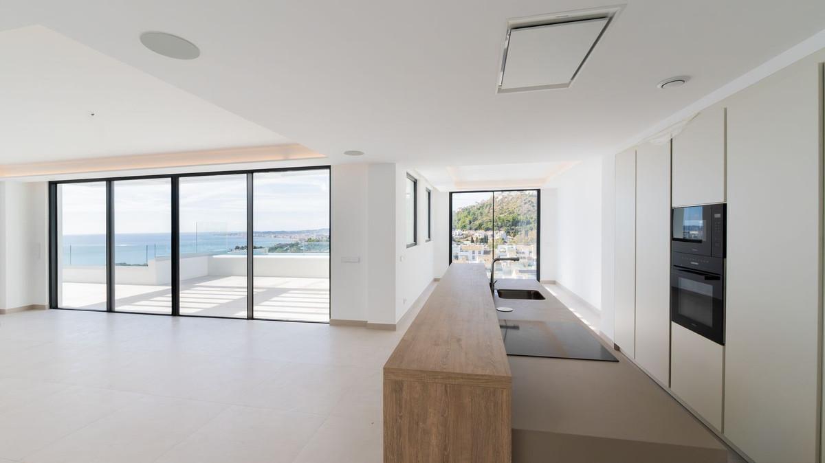 L'espace principal réunit une cuisine design, une salle à manger et un salon dans un concept ouvert qui s'ouvre sur une terrasse exposée sud-ouest. Vous pourrez y profiter pleinement de la vie en plein air sur une vaste terrasse spectaculaire agrémentée d'une piscine privée.