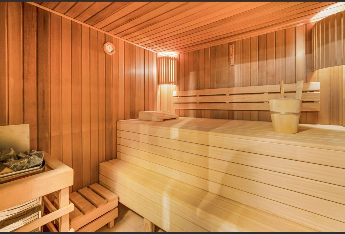Une salle de cinéma et de jeux ultramoderne équipée d'une salle de sport, d'un sauna, d'une douche à jets, de toilettes et d'une buanderie avec accès au garage.