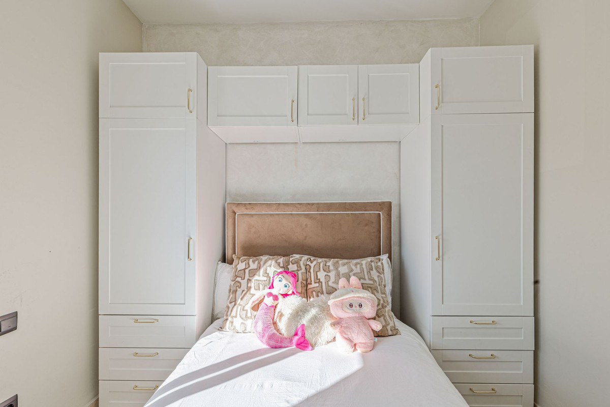 À l'étage, le premier niveau comprend quatre chambres doubles et une salle de bains familiale, offrant un espace modulable pour accueillir des invités, aménager des bureaux, des salles de loisirs ou accueillir une famille qui s'agrandit. Deux chambres plus spacieuses, situées à l'arrière, partagent un balcon privé offrant une vue imprenable sur la mer et les montagnes : un havre de paix idéal pour savourer un matin tranquille, un dernier verre en soirée ou prolonger les conversations.