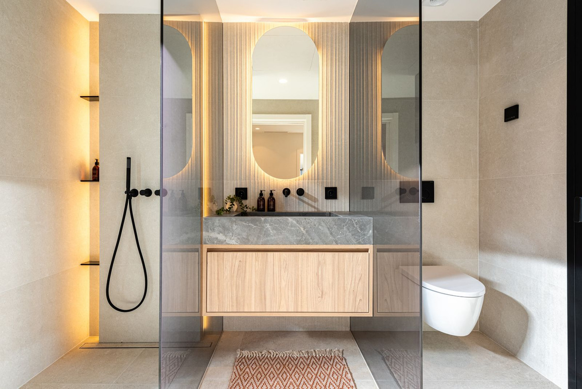 Le rez-de-chaussée s'articule autour d'un espace de vie ouvert et convivial, où la cuisine, la salle à manger et le salon communiquent harmonieusement. La cuisine, véritable cœur de la maison, se distingue par ses appareils Smeg, son cave à vin intégrée et son généreux plan de travail. Le salon, baigné de lumière grâce à sa double hauteur sous plafond, ses grandes baies vitrées donnant sur le jardin et son élégante cheminée à l'éthanol qui apporte chaleur et convivialité sans dénaturer le design épuré et moderne, bénéficie d'une atmosphère aérée tout au long de la journée.