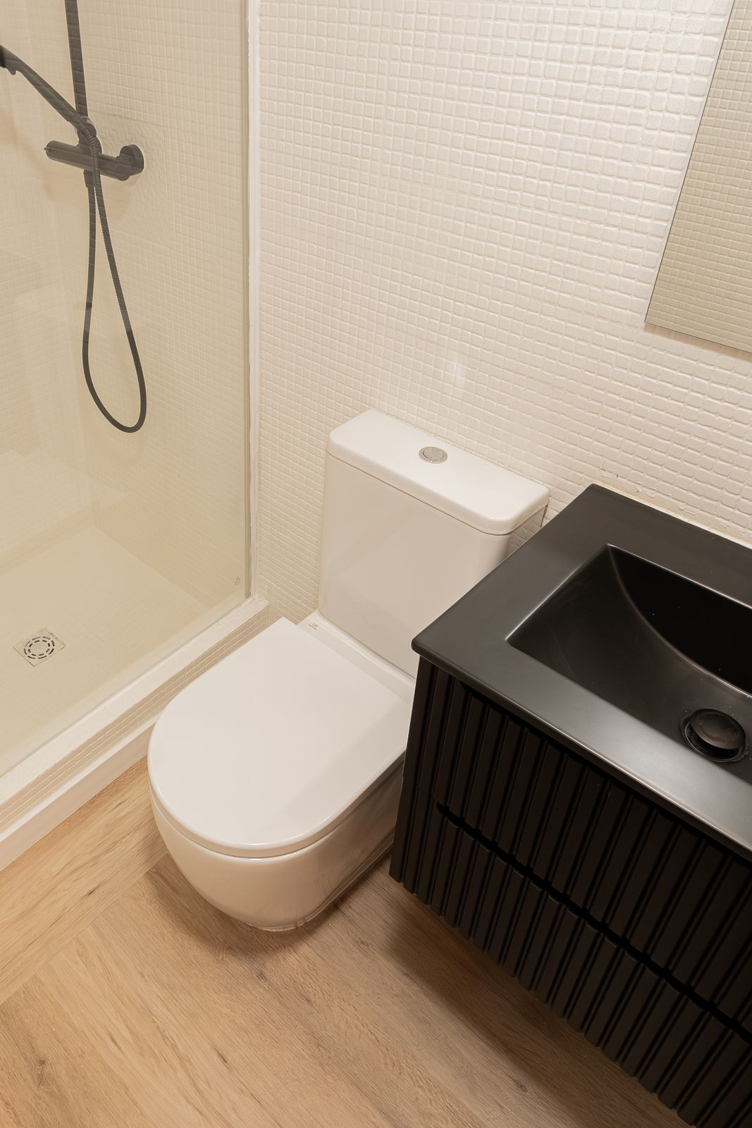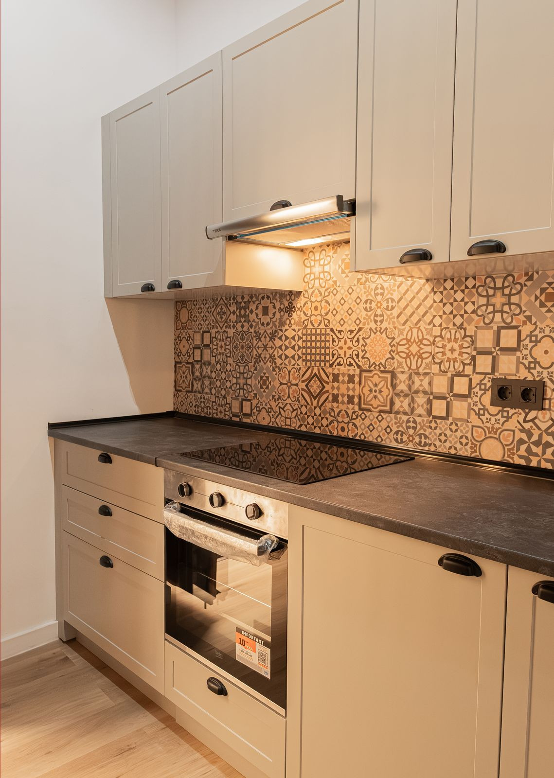 La cuisine, entièrement neuve et conçue sur mesure pour ce bien, comprend une hotte aspirante, une plaque de cuisson vitrocéramique, un four, un lave-linge séchant et un réfrigérateur intégré — le tout neuf et jamais utilisé, et inclus dans le prix. Le mobilier du salon et de la chambre est également neuf et jamais utilisé.