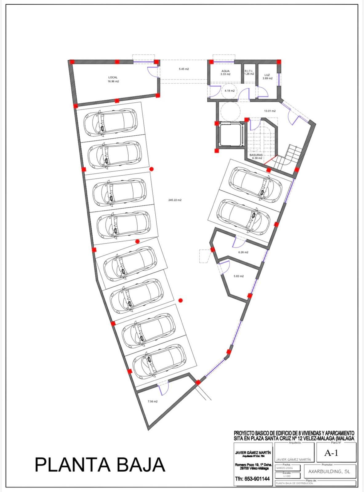 Terrain de 385 m² à vendre situé à Plaza Santa Cruz, Vélez-Málaga, avec possibilité de construire un immeuble d'appartements résidentiels comprenant un rez-de-chaussée pour le parking, un premier étage et un deuxième étage.