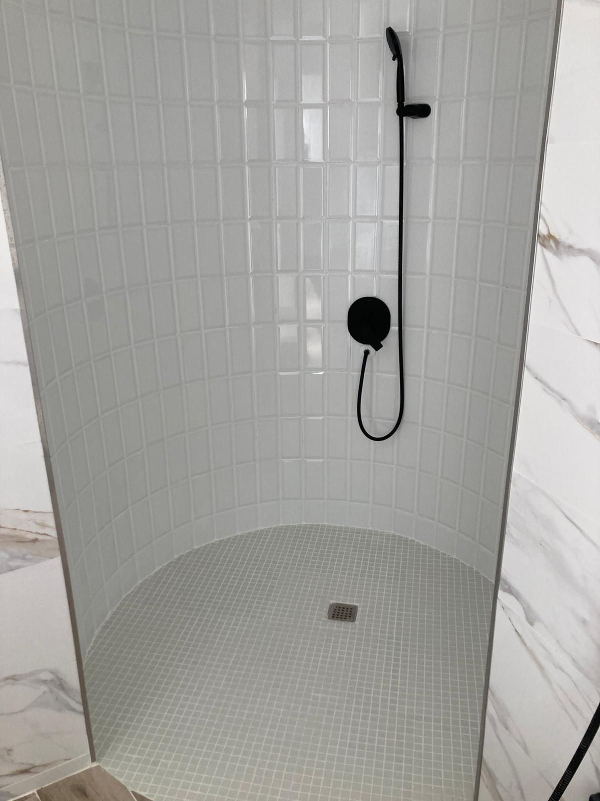 1 salle de bain complète avec une grande douche.