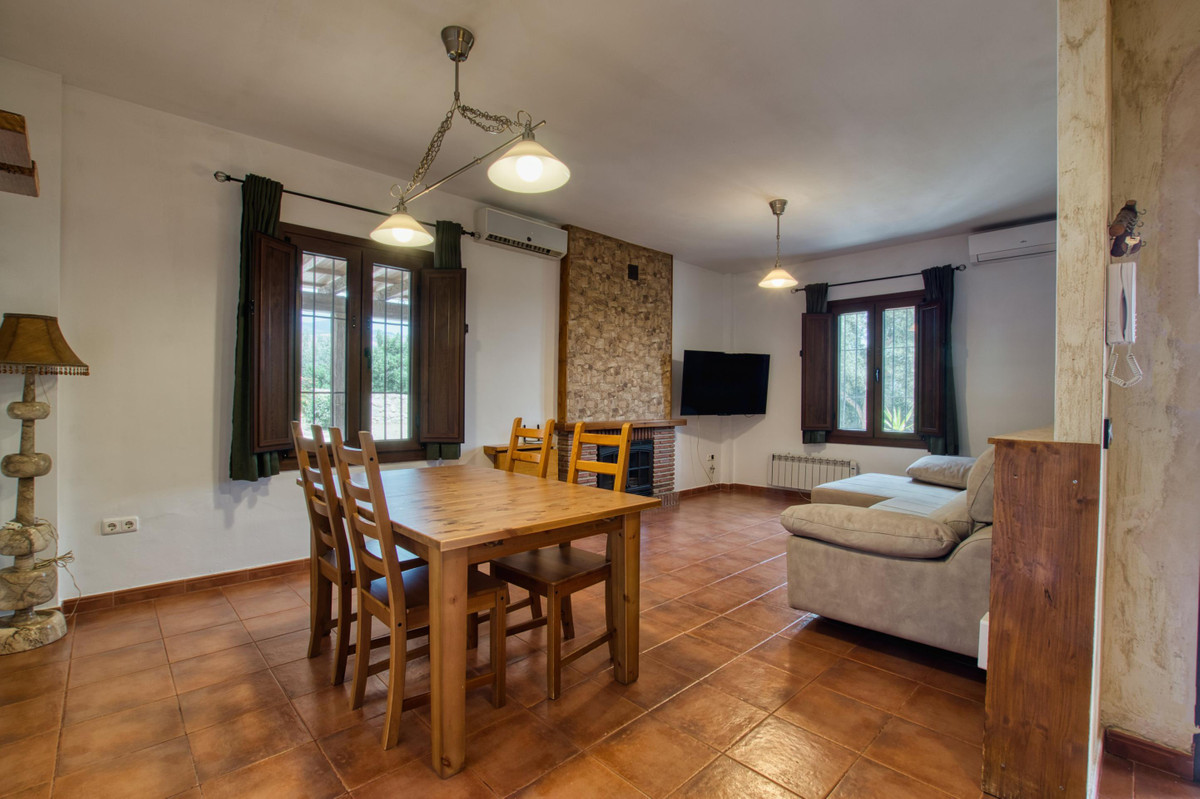L'intérieur de la maison principale dégage un charme rustique et chaleureux. Le séjour-salle à manger, dominé par une cheminée à bois encadrée de pierres, est l'endroit idéal pour les soirées d'hiver. La cuisine ouverte et fonctionnelle, avec ses placards en bois, conserve le style traditionnel de la maison et est entièrement équipée.