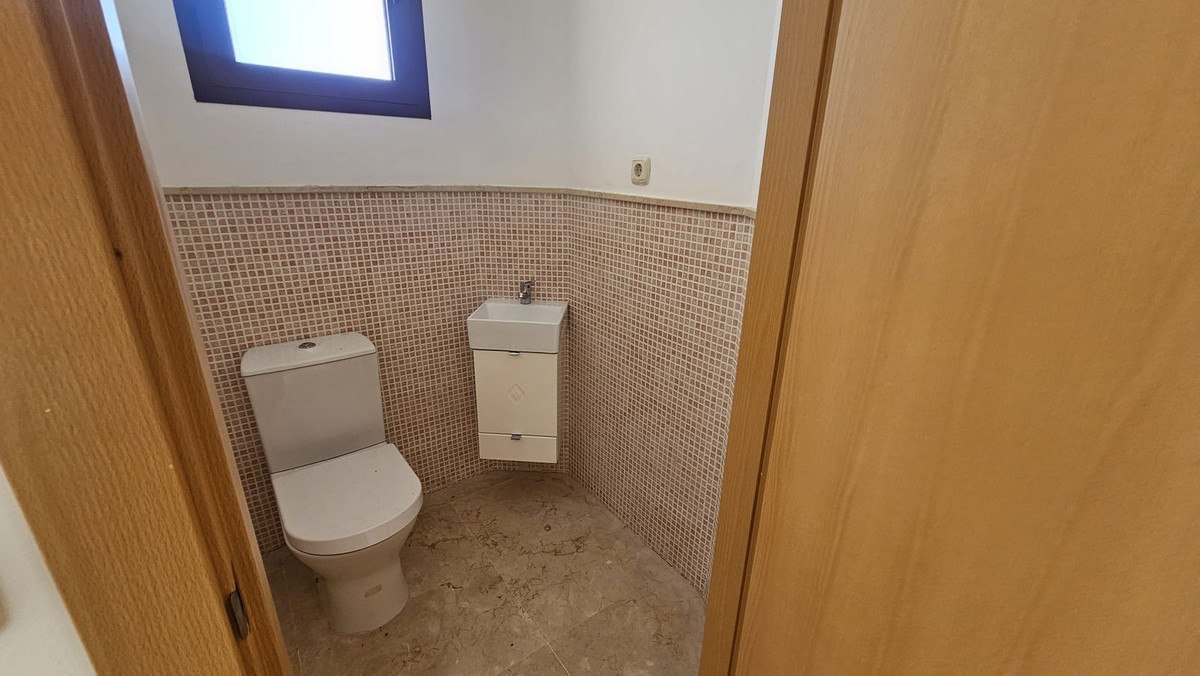 L'entrée principale se situe à l'étage, où vous êtes accueillis par un salon-salle à manger lumineux, une cuisine avec buanderie et une agréable terrasse couverte, idéale pour en profiter toute l'année grâce au climat privilégié de la région.