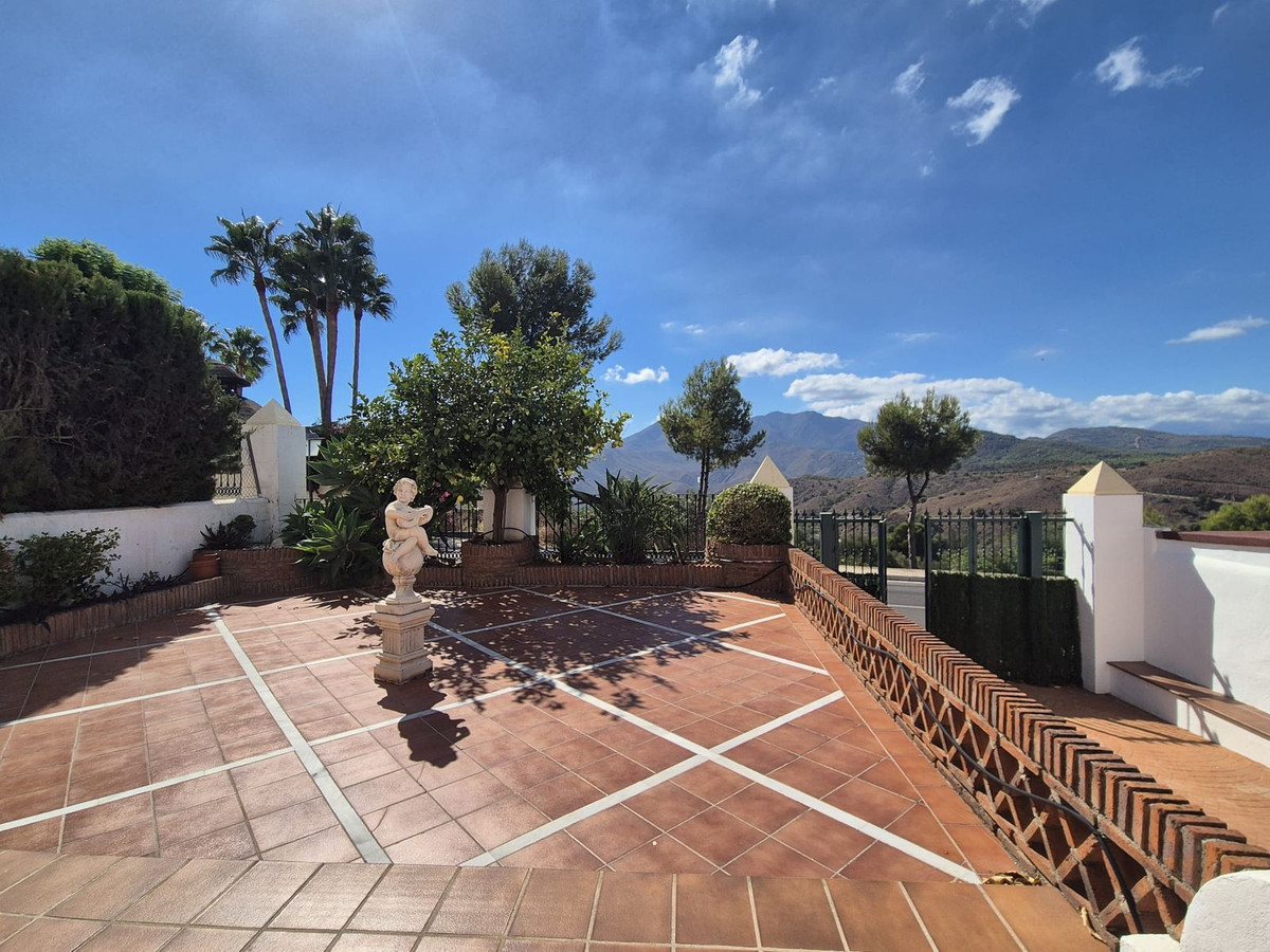 Vous accédez à la propriété par le portail privé, où se trouve votre propre place de parking. Quelques marches vous mènent au niveau principal où se trouvent la maison et les terrasses. Vous disposez d'une grande terrasse avant facile d'entretien avec des parterres de fleurs équipés d'un système d'arrosage automatique, ainsi que d'une terrasse couverte avec un agréable coin salon et une vue imprenable sur le golf, les montagnes et le coucher du soleil. La propriété est répartie sur deux niveaux. En entrant, à gauche, vous trouverez une salle de bain complète, l'escalier menant au deuxième niveau et un espace de rangement sous l'escalier. En face de vous se trouve une grande cuisine entièrement équipée avec une porte donnant accès à la terrasse arrière. À droite du couloir se trouve le grand séjour/salle à manger climatisé, doté de deux portes-fenêtres coulissantes ouvrant sur la terrasse avant. À l'étage, en face de vous, se trouve la suite parentale avec placards intégrés, terrasse privative et salle de bain complète. À gauche du couloir se trouvent les deux autres chambres doubles avec placards intégrés et une salle de bain à partager. La maison est équipée de deux climatiseurs réversibles centralisés.