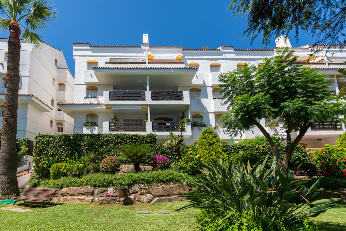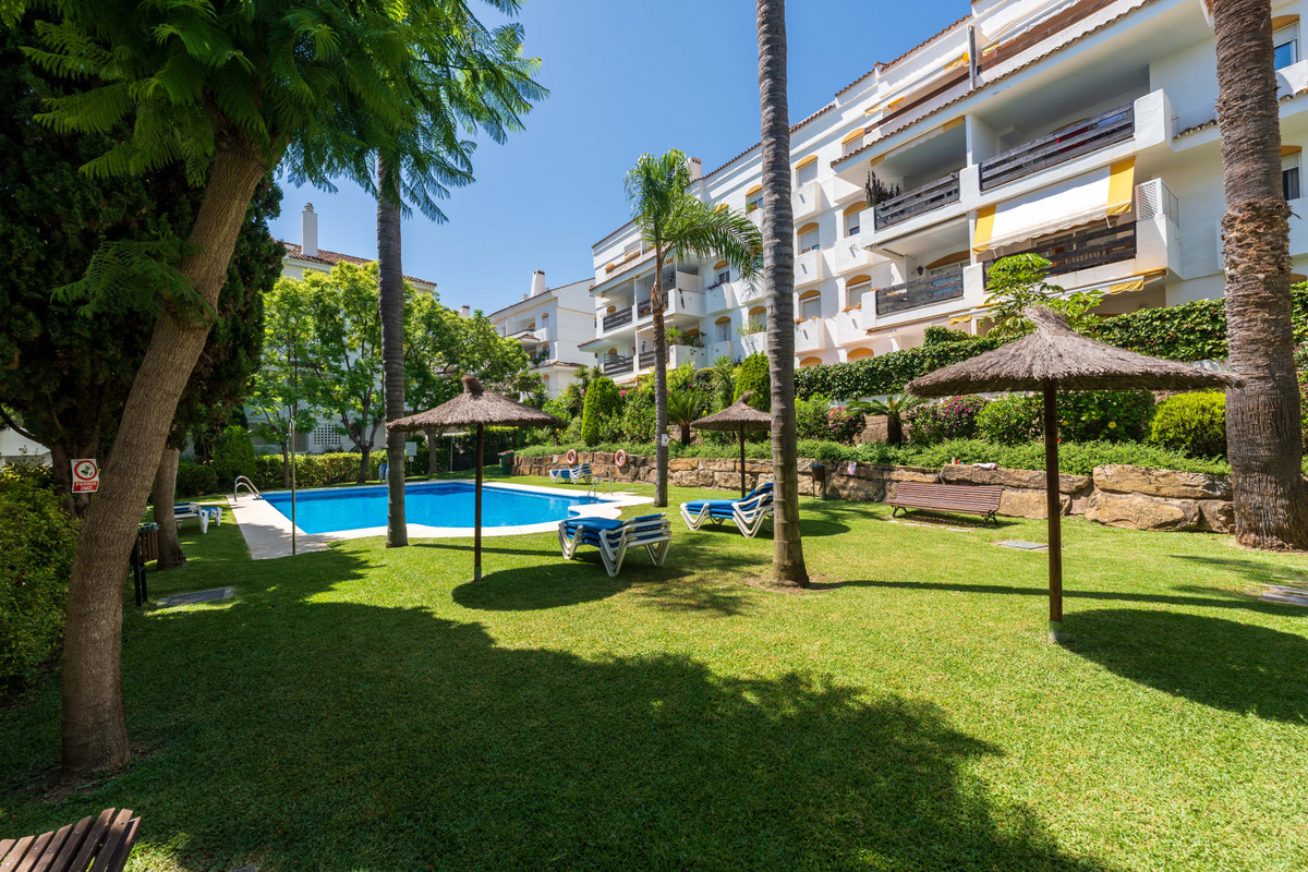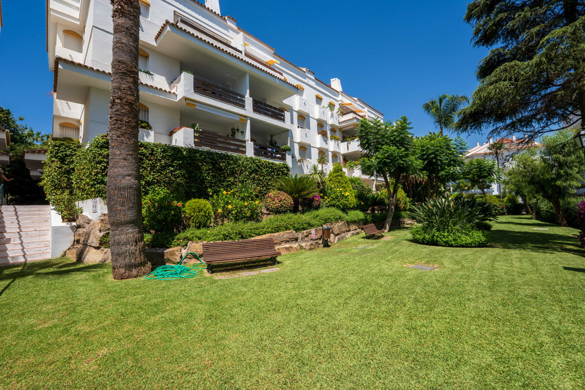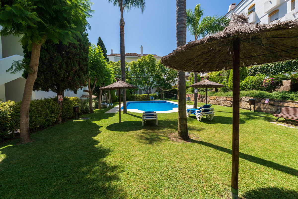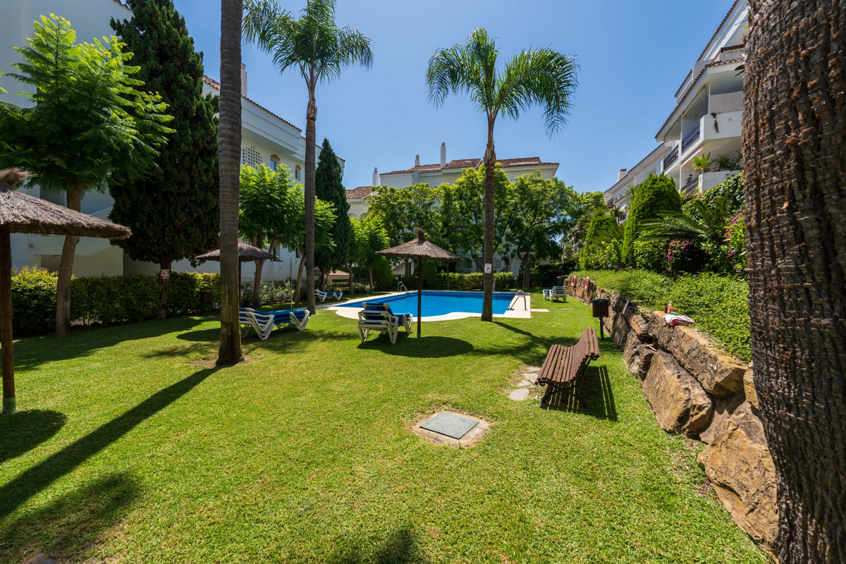 Magnifique appartement de plain-pied à Guadalmina Baja, San Pedro de Alcántara, avec un jardin et une terrasse couverte orientée est pour profiter des matinées ensoleillées et des après-midi plus frais, situé à proximité du terrain de golf.