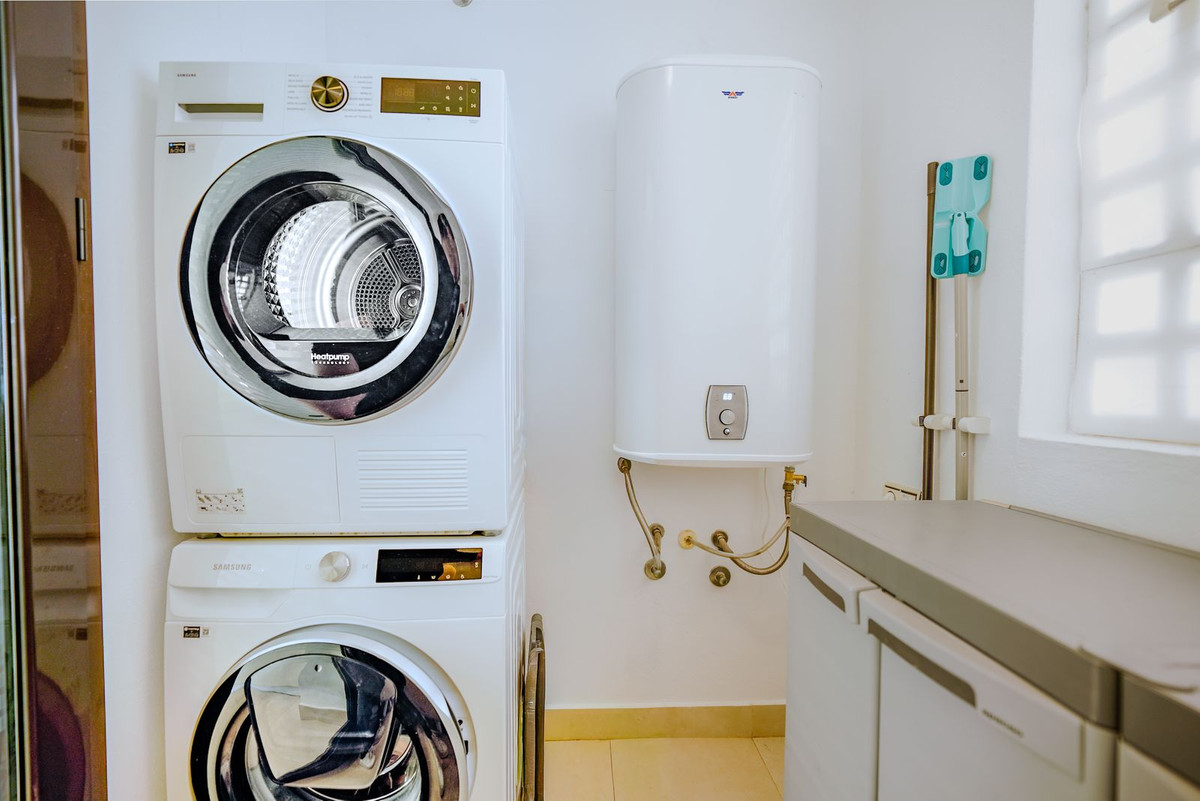 L'espace de vie ouvert, comprenant salon et salle à manger, communique harmonieusement avec une cuisine entièrement équipée d'appareils haut de gamme Siemens et Bosch. Une buanderie séparée avec lave-linge et sèche-linge apporte un confort supplémentaire. L'appartement bénéficie également d'une climatisation réversible, d'un chauffage au sol dans les salles de bains et d'une excellente ventilation naturelle grâce à sa situation en hauteur.