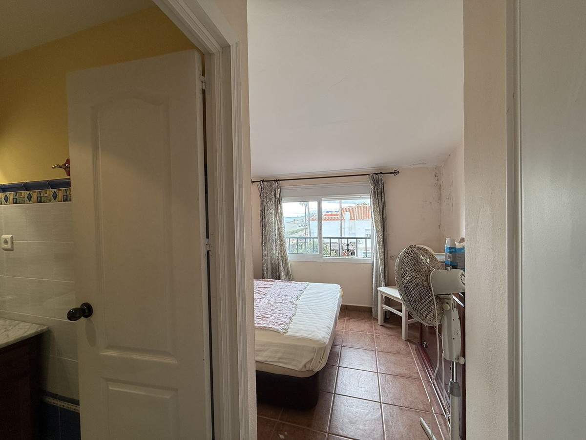 La chambre principale dispose d'une salle de bains attenante avec placards intégrés du sol au plafond, vue sur la mer, la Torre La Sal et la baie de Casares, ainsi que d'une salle de bains spacieuse avec fenêtre.