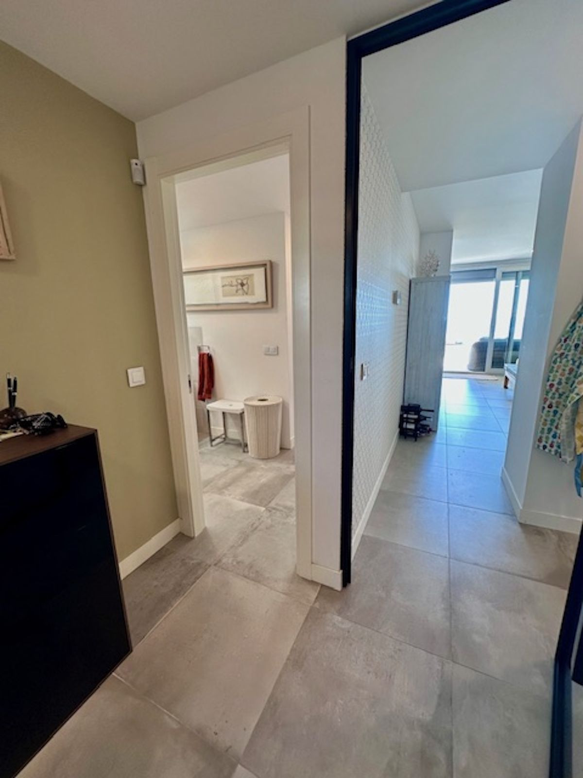L'agencement comprend : un hall d'entrée, une cuisine ouverte, un séjour-salle à manger avec accès à la terrasse, une chambre secondaire (actuellement utilisée comme bureau), une salle de bains complète et la chambre principale avec une salle de bains attenante (divisée en deux espaces), un dressing et un accès direct à la terrasse.