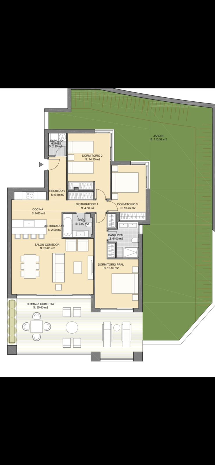 Caractéristiques du bien : rez-de-chaussée avec accès par ascenseur, espace de vie spacieux avec accès à la terrasse et au jardin privé, cuisine entièrement équipée avec appareils NEFF, climatisation réversible via Aerothermia, chauffage au sol dans les salles de bains, système domotique avec application de contrôle pour l’éclairage, les stores et la température.