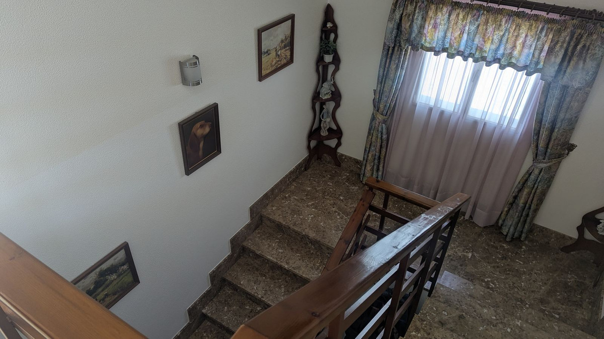 Au rez-de-chaussée, vous trouverez un salon confortable, une cuisine indépendante, deux chambres et une salle de bain complète. À l'étage, accessible par un large escalier, se trouvent trois chambres avec placards intégrés et une deuxième salle de bain complète — idéal pour les familles nombreuses, les invités ou pour aménager un bureau à domicile.
