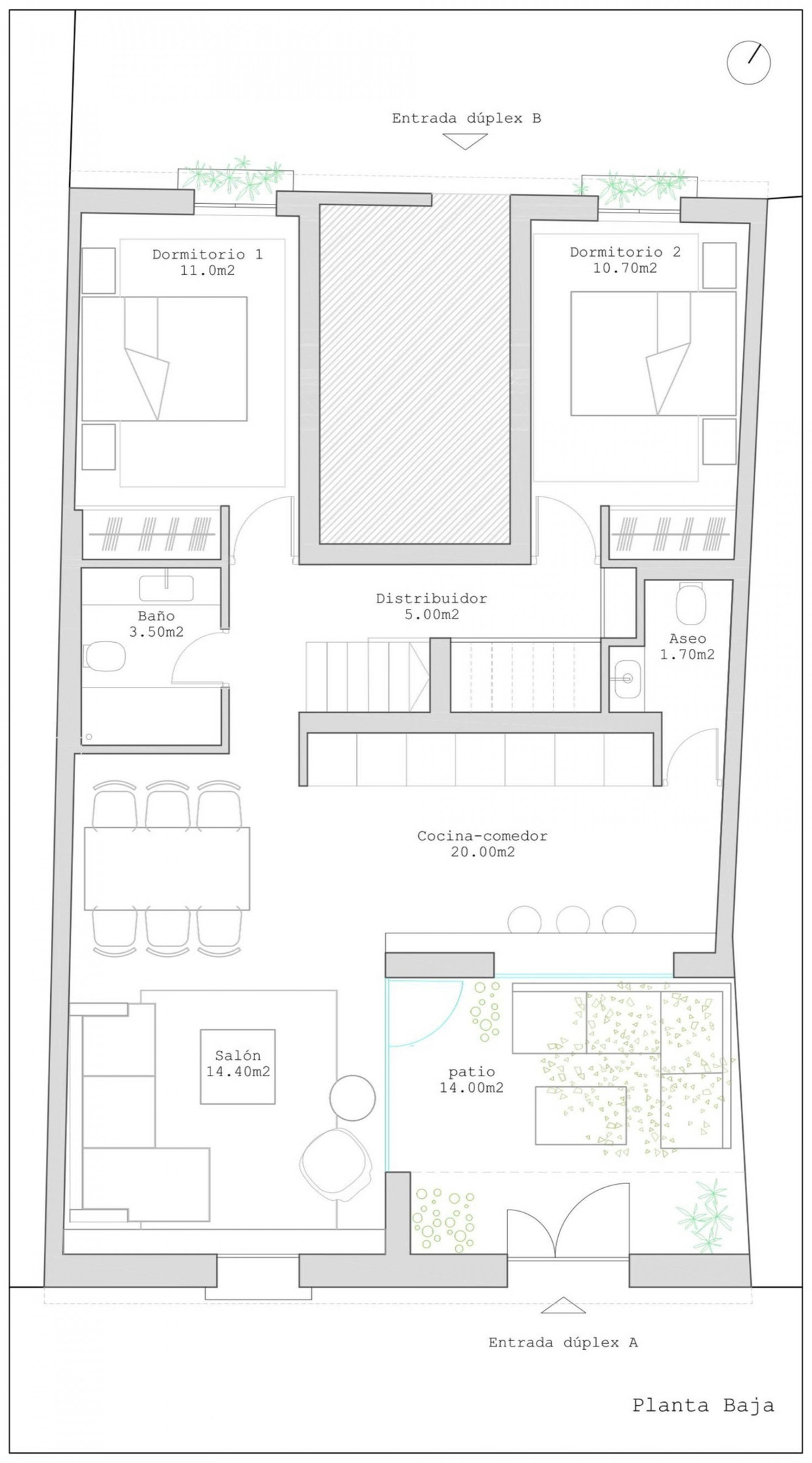 Le rez-de-chaussée comprend un vaste espace de vie ouvert regroupant salon, salle à manger et cuisine, qui communique harmonieusement avec un charmant patio intérieur de 14 m² baigné de lumière naturelle et bien ventilé. Ce niveau offre également deux chambres, une salle de bains complète et des toilettes invités.