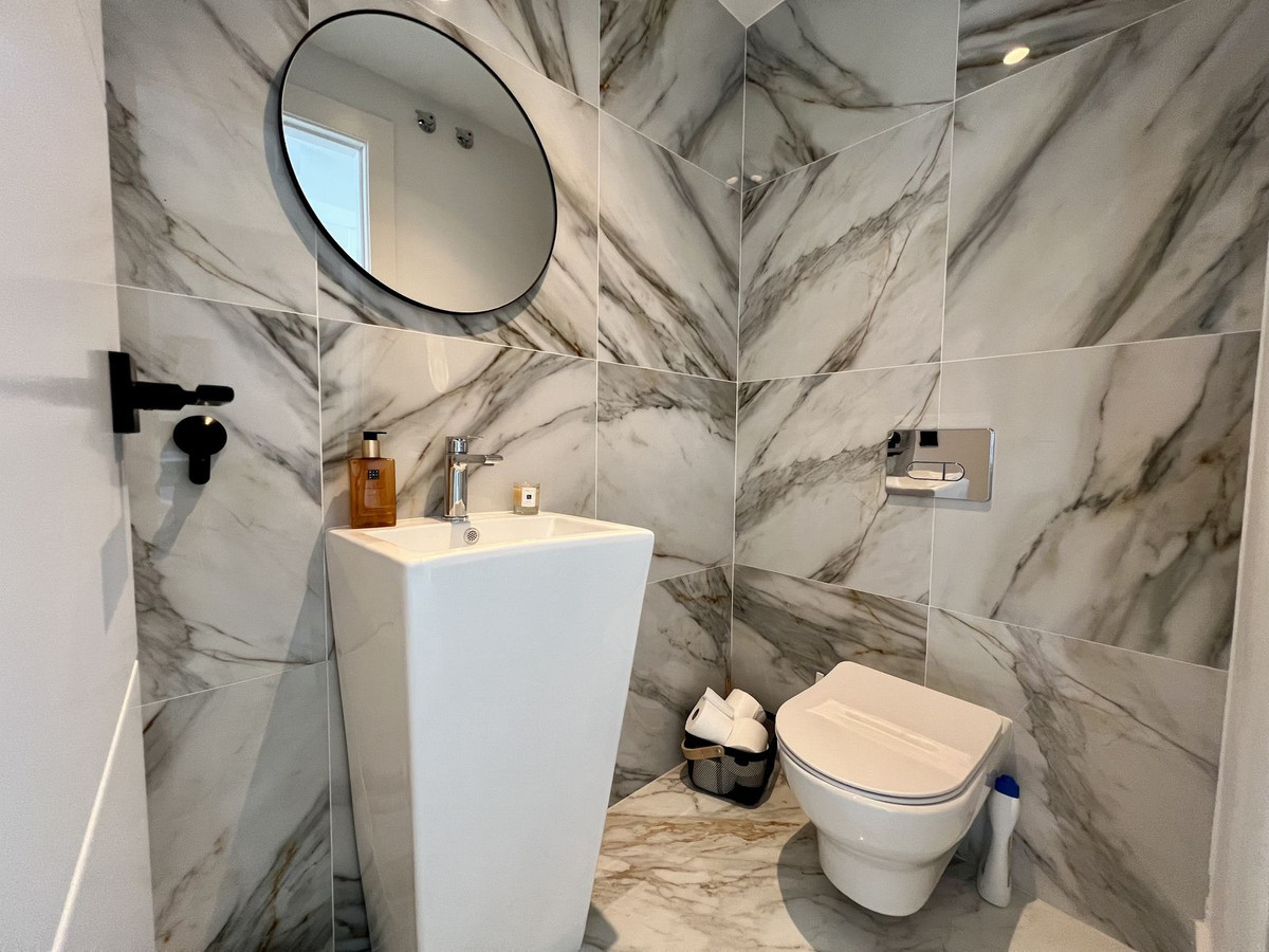 Le rez-de-chaussée offre un espace de vie lumineux et ouvert comprenant un salon et une salle à manger, avec des baies vitrées donnant directement sur la terrasse. La cuisine moderne est entièrement équipée d'appareils Bosch et d'un îlot central. Ce niveau comprend également des toilettes invités et une chambre double avec salle de bains privative.