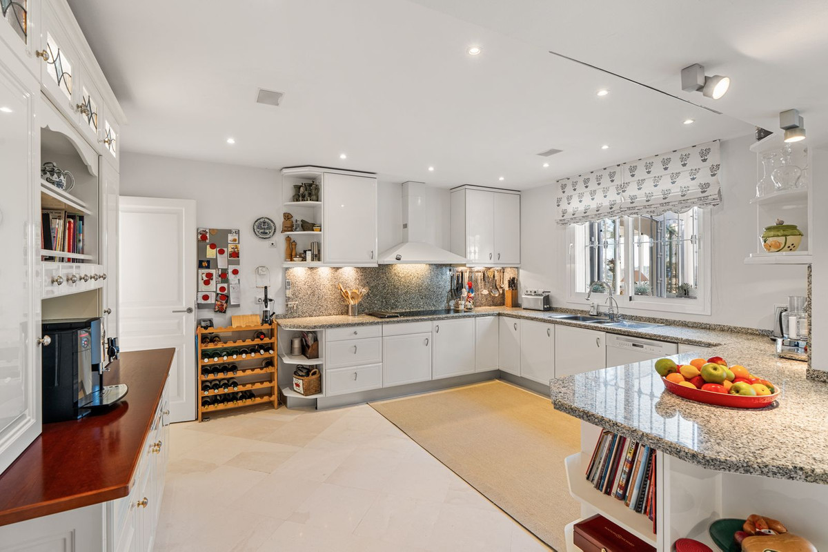 La cuisine entièrement équipée se trouve juste à côté, séparée du séjour, et donne directement sur l'une des terrasses, ce qui en fait l'endroit idéal pour savourer un petit-déjeuner tranquille en plein air. Elle comprend également un cellier climatisé, parfait pour conserver les provisions dans de bonnes conditions.