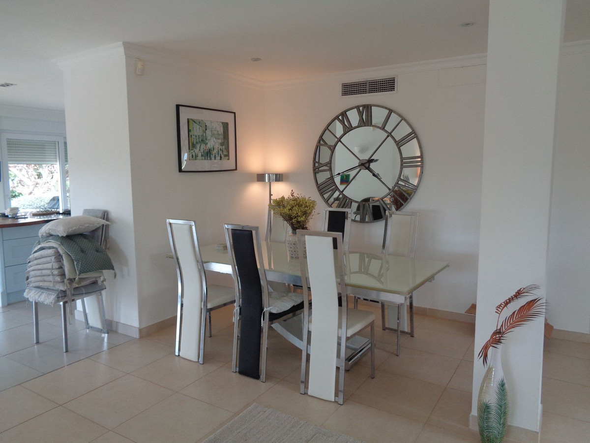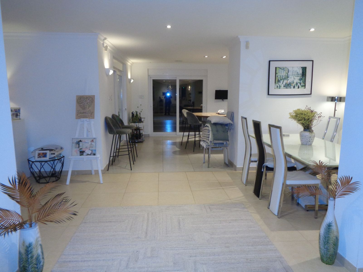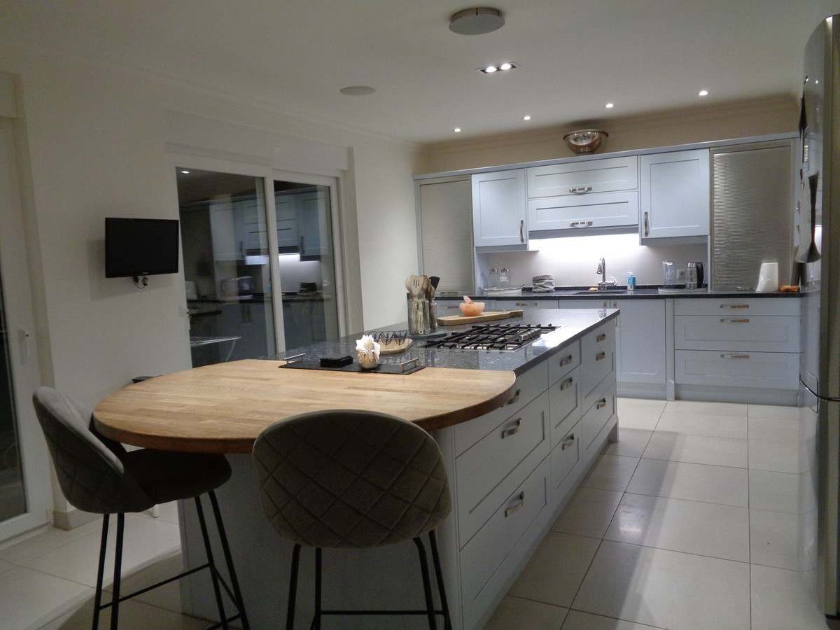 Un bel espace repas sépare le salon de la cuisine. La cuisine spacieuse est dotée d'un grand îlot central faisant office de coin repas et d'équipements modernes. Très accueillante et baignée de lumière, elle s'ouvre sur les terrasses, le jardin et la piscine grâce à trois portes-fenêtres.