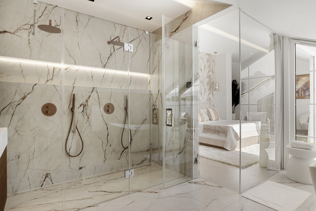 Ce penthouse comprend cinq chambres magnifiquement aménagées, dont une suite parentale spectaculaire à l'étage. Avec ses plafonds mansardés, son vaste dressing, sa salle de bains digne d'un spa et sa terrasse privée offrant une vue imprenable sur la mer et le mont La Concha, c'est un véritable havre de paix. Deux autres chambres disposent chacune d'une salle de bains privative, tandis que deux autres partagent une salle de bains familiale moderne. Une cinquième pièce modulable peut servir de chambre d'amis ou de bureau. Une buanderie séparée avec accès à la terrasse témoigne du soin apporté aux moindres détails pratiques.
