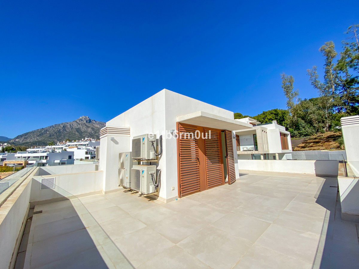 Nouvelle villa jumelée au cœur du Golden Mile de Marbella, à seulement 300 m de la plage et du Puente Romano. À cinq minutes en voiture du centre de Marbella et de Puerto Banús. Piscine commune sécurisée 24h/24, salle de sport et spa. Saisissez cette opportunité d'acquérir une maison jumelée neuve de trois chambres (une quatrième au sous-sol), trois salles de bains et une piscine privée. Au rez-de-chaussée, cuisine ouverte sur le séjour donnant sur un jardin privatif et WC invités. Le premier étage comprend trois chambres, dont une suite parentale, et deux chambres partageant une salle de bains. Au deuxième étage, un magnifique solarium offre une vue imprenable sur la Concha. Le sous-sol abrite un séjour, une quatrième chambre et une salle de bains. Deux places de parking avec accès direct à la maison et un espace de rangement sont également inclus.