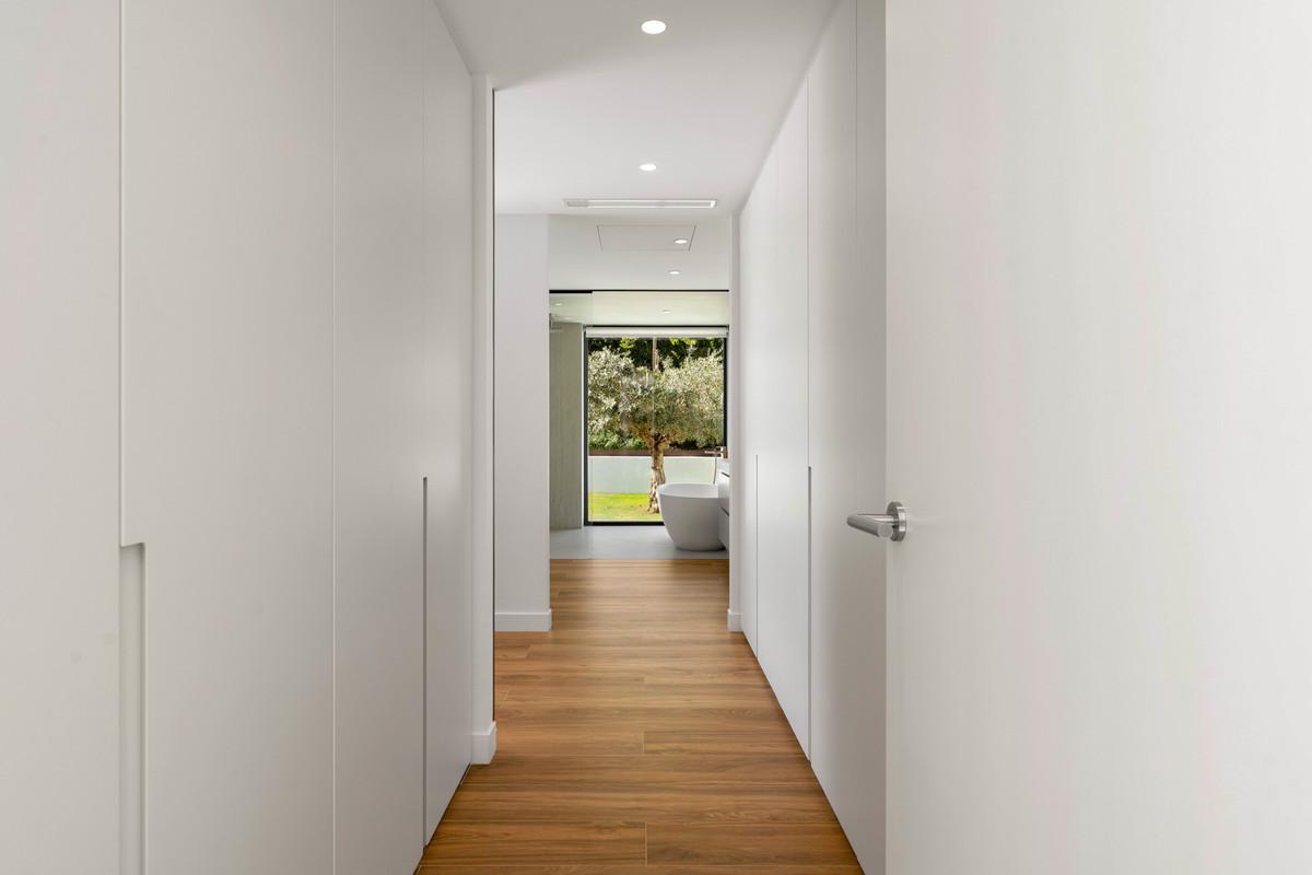 La villa comprend six chambres et d'impressionnants plafonds de 3,5 mètres de haut au niveau principal, créant une sensation d'espace et de profondeur immédiate. Un vaste espace de vie ouvert, comprenant salon et cuisine, donne directement sur la piscine et les espaces de divertissement extérieurs, renforçant le style de vie luxueux qui caractérise une villa haut de gamme à Marbella. La cuisine moderne et élégante est entièrement équipée d'appareils Siemens intégrés, de nombreux rangements et d'un bar raffiné avec deux caves à vin.