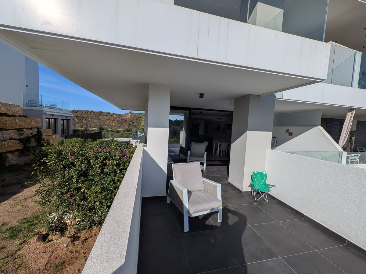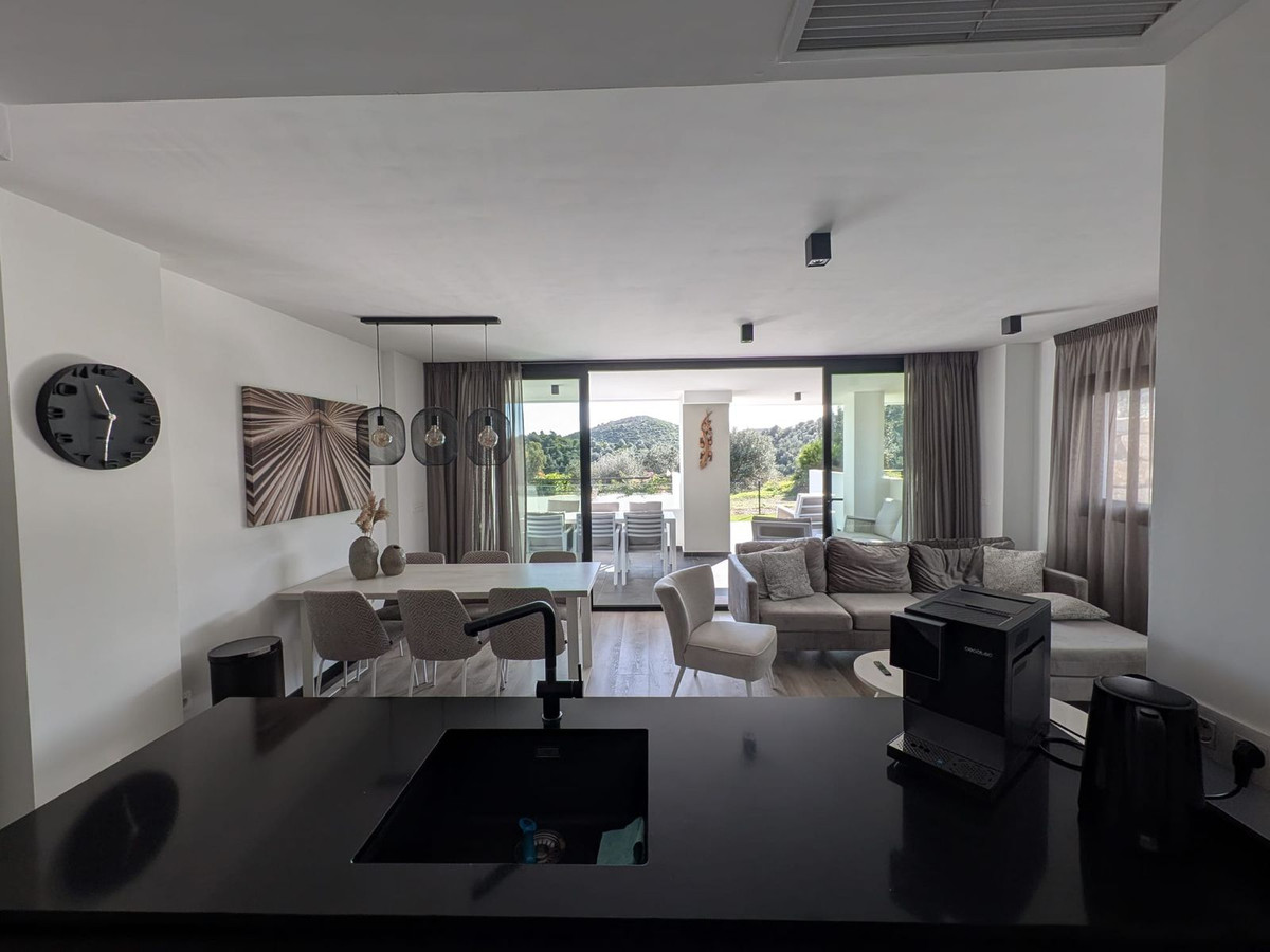 Built in 2023 and presented in excellent condition, the apartment features three bedrooms and two bathrooms, with a bright and exceptionally spacious living area that flows directly onto expansive terraces. The southwest orientation ensures abundant natural light throughout the day, while panoramic views stretch across the Mediterranean Sea, the mountains, and the beautifully landscaped gardens and pool areas.
