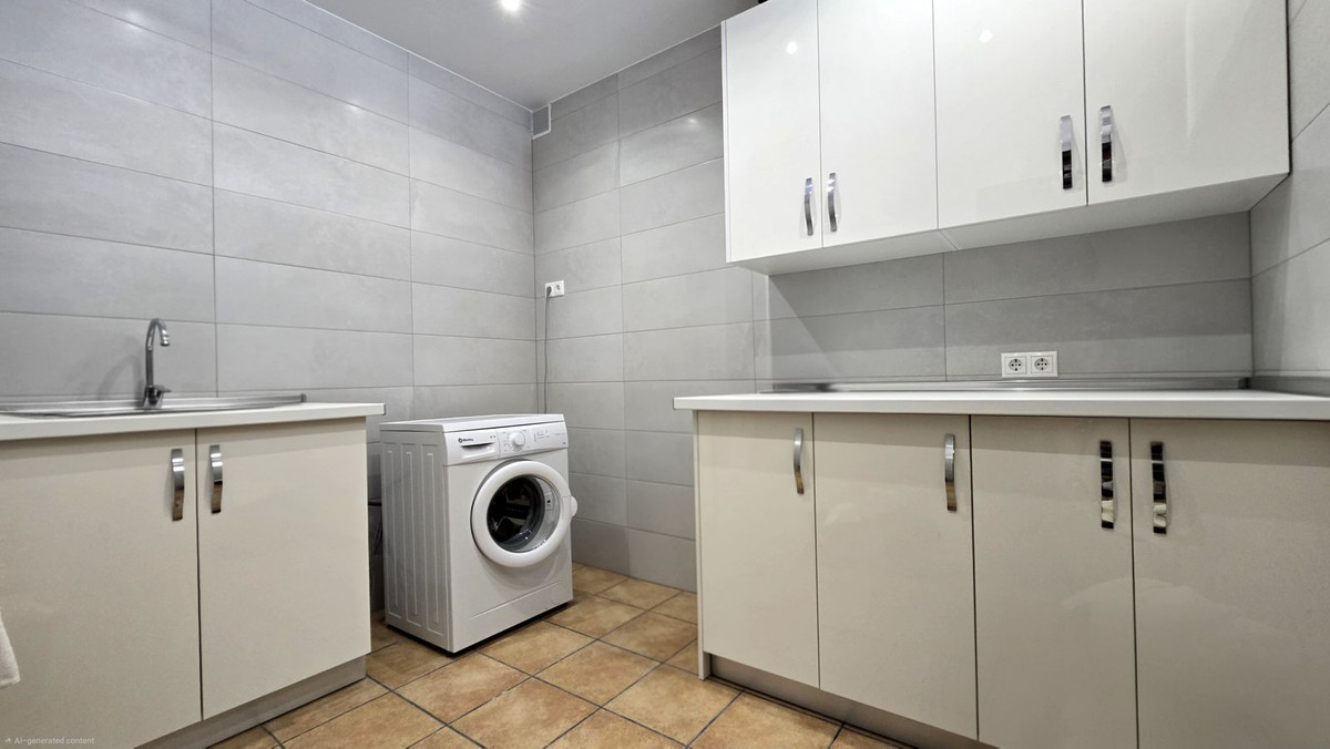 Descendez le petit escalier. À gauche se trouve une très grande buanderie avec évier, lave-linge, placards de cuisine intégrés, ainsi que des rangements et un petit cellier.