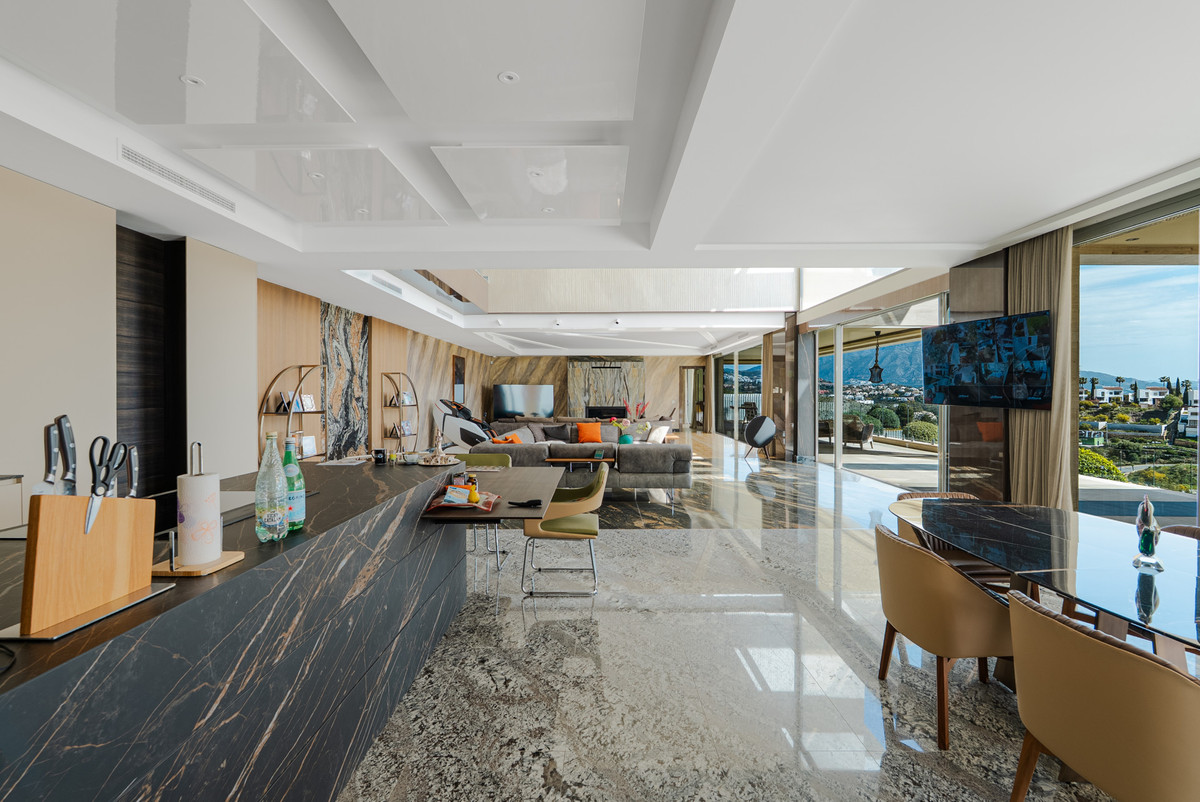 La villa offre de vastes espaces de vie décloisonnés où salon, salle à manger et cuisine se fondent harmonieusement. De grandes baies vitrées coulissantes inondent les intérieurs de lumière naturelle et donnent un accès direct aux terrasses extérieures.