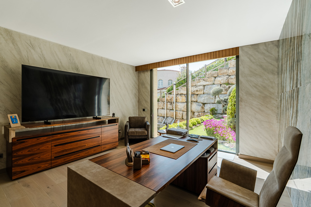 Cette villa se distingue par l'utilisation exceptionnelle de matériaux naturels haut de gamme. Les surfaces en marbre et en onyx grand format confèrent à l'ensemble de la propriété une esthétique luxueuse et unique.
